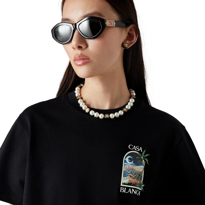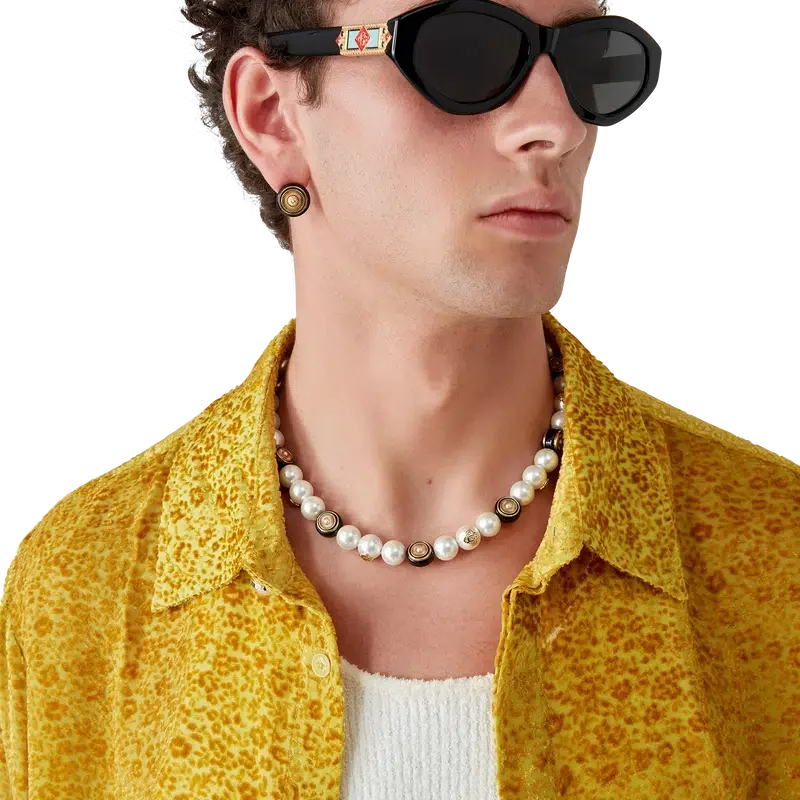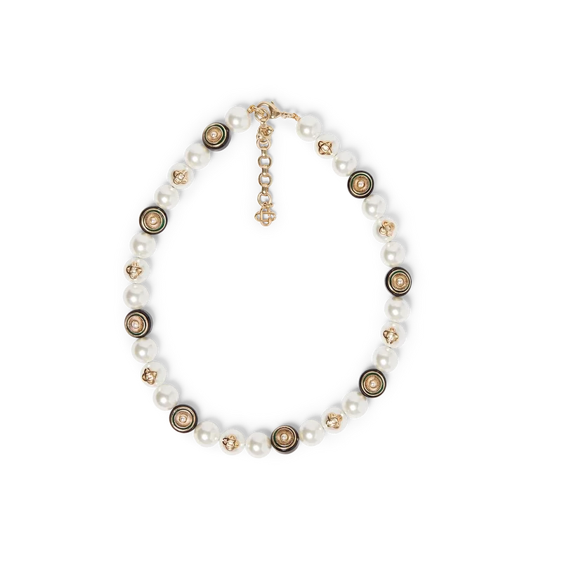 Spoke Wheel-halsbandet är tillverkat av guldpläterad mässing, emalj och sötvattenspärlor. Försedd med husets sammanflätade CC-logotyp, guldpläterad kedja och karbinhake.