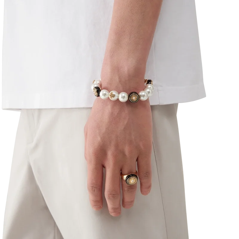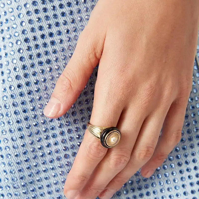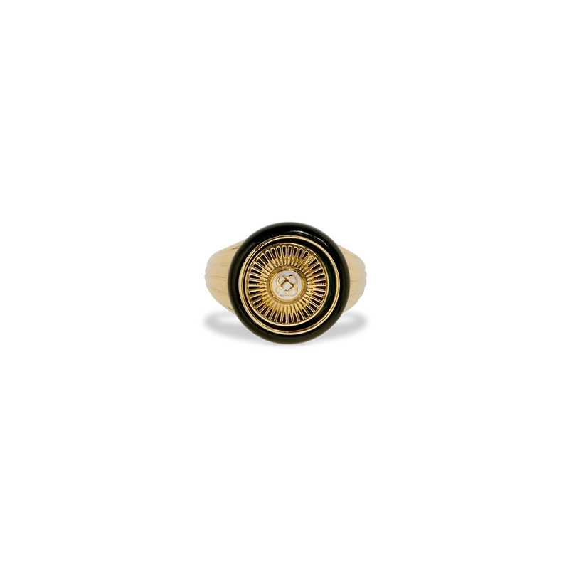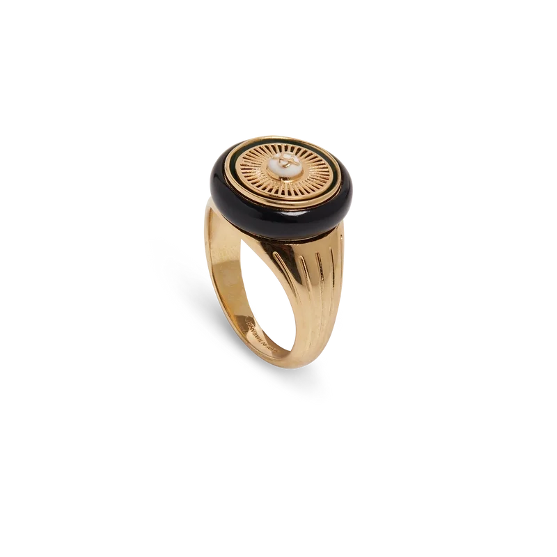 Spoke Wheel-ringen är tillverkad av guldpläterad mässing och emalj. Den kompletteras med husets sammanlänkade Cc-logotyp i mitten av den hjulformade framsidan och linjer ingraverade i ringbandet.