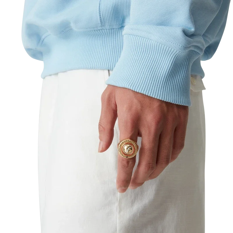 Sports Medallion-ringen är tillverkad av guldpläterad mässing och handmålad emalj. Den kompletteras med husets signaturdiamantlogo på ringstammen.