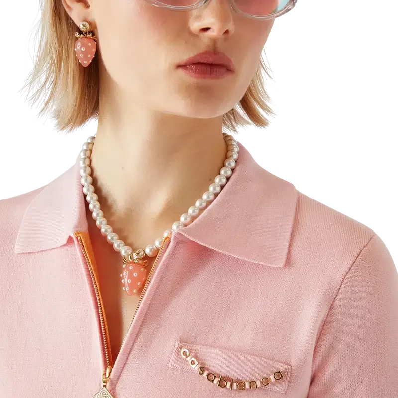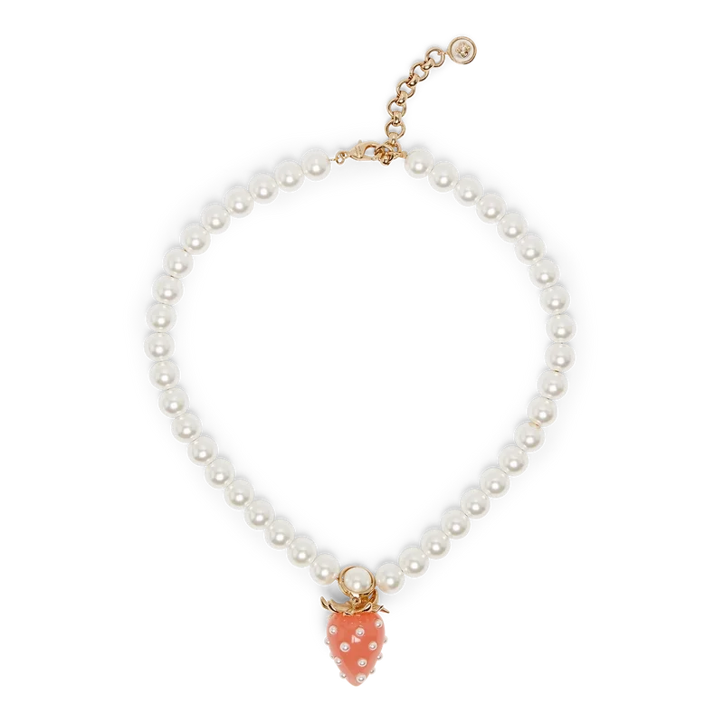 Jordgubbshalsbandet har en elegant design och är tillverkat av guldpläterad mässing och imiterade pärlor. Kompletterat med en klassisk kedjekonstruktion, ett rosa jordgubbssmycke, karbinlås och justerbar kedja.