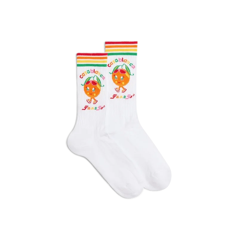 Kawaii Orange-strumporna är vita sportstrumpor tillverkade av ett bomullsblandat tyg och pryds av säsongens motiv med denna karaktär, utformad som en apelsin, en annan nyckelperson i vårt universum, med Casa-accessoarer, glasögon och sneakers. Avslutade med ribbade ben och gröna, gula, orange, röda och vita randiga detaljer på muddarna.