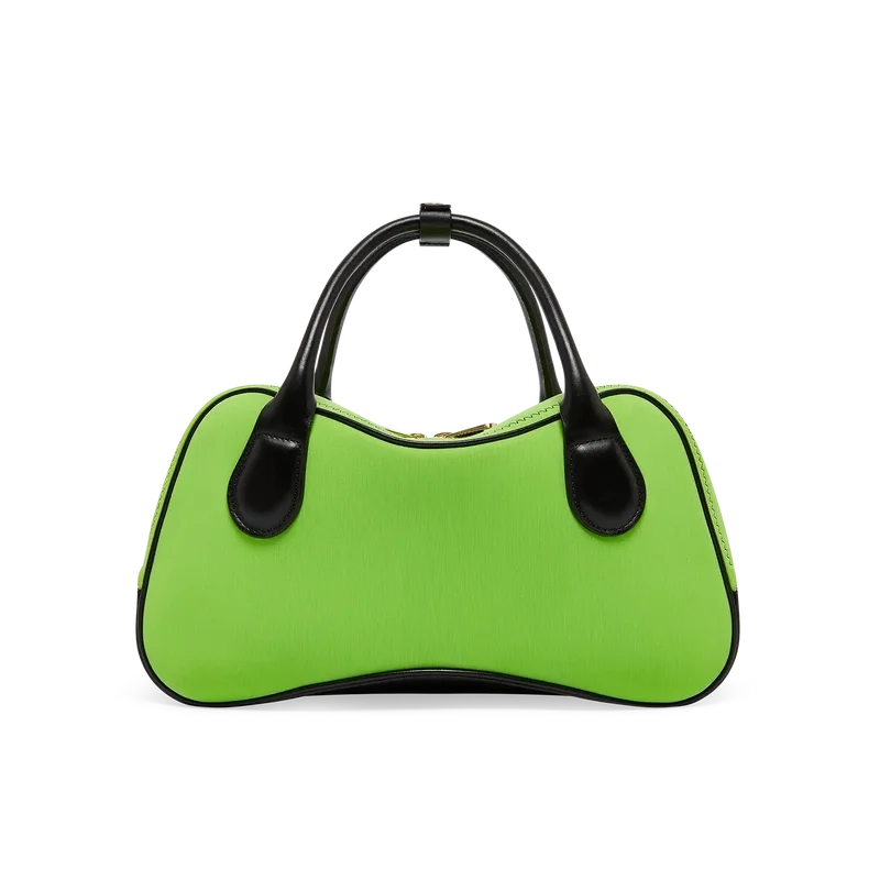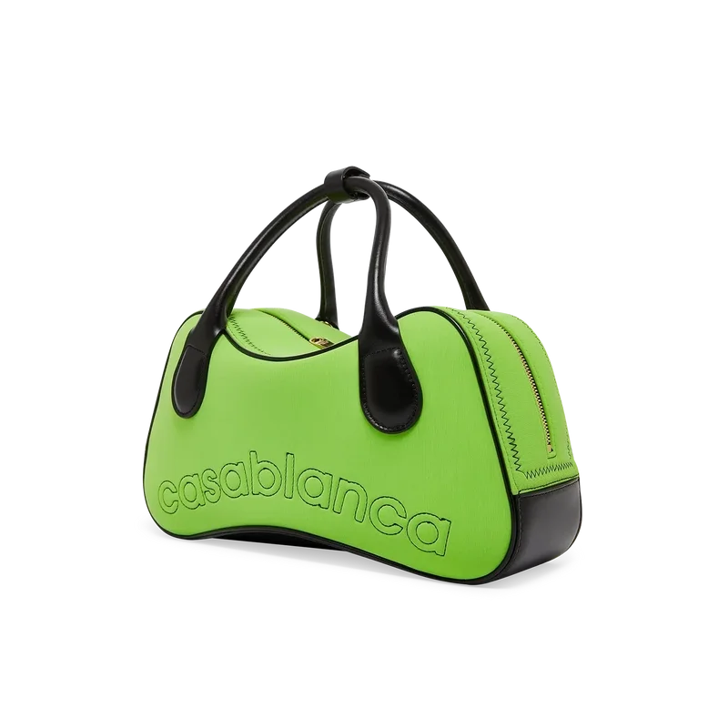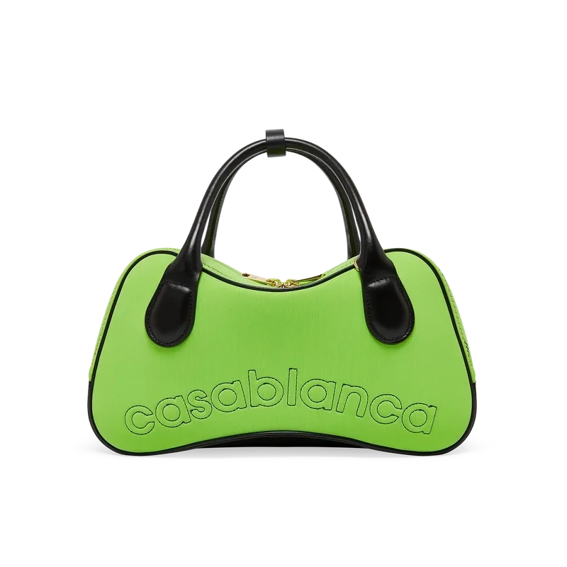 Den gröna Bowling Mini-väskan är tillverkad av italienskt kalvskinn och prydd med husets signaturlogotyp Casablanca. Komplett med högkvalitativa metallbeslag, dragkedja, kantband, en justerbar axelrem och två handtag.