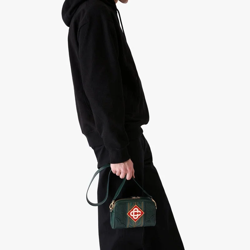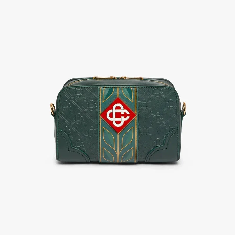 Den gröna Monogram-axelremsväskan är tillverkad av italienskt kalvskinn och pryds av husets Monogram-mönster och signaturdiamantlogotyp på sidan. Den kompletteras med husets signaturlagerkransmotiv, en axelrem, dragkedja, en ytterficka med dragkedja, en innerficka och beslag i mässing. Levereras med en presentask med Casablanca-logotyp, en dammpåse och en produktbroschyr.