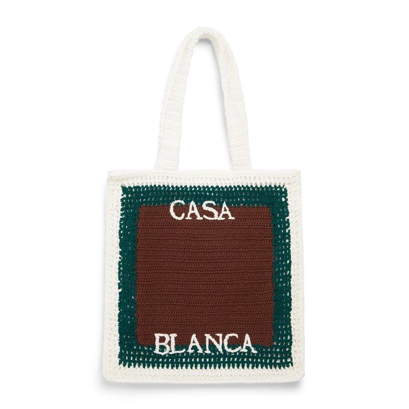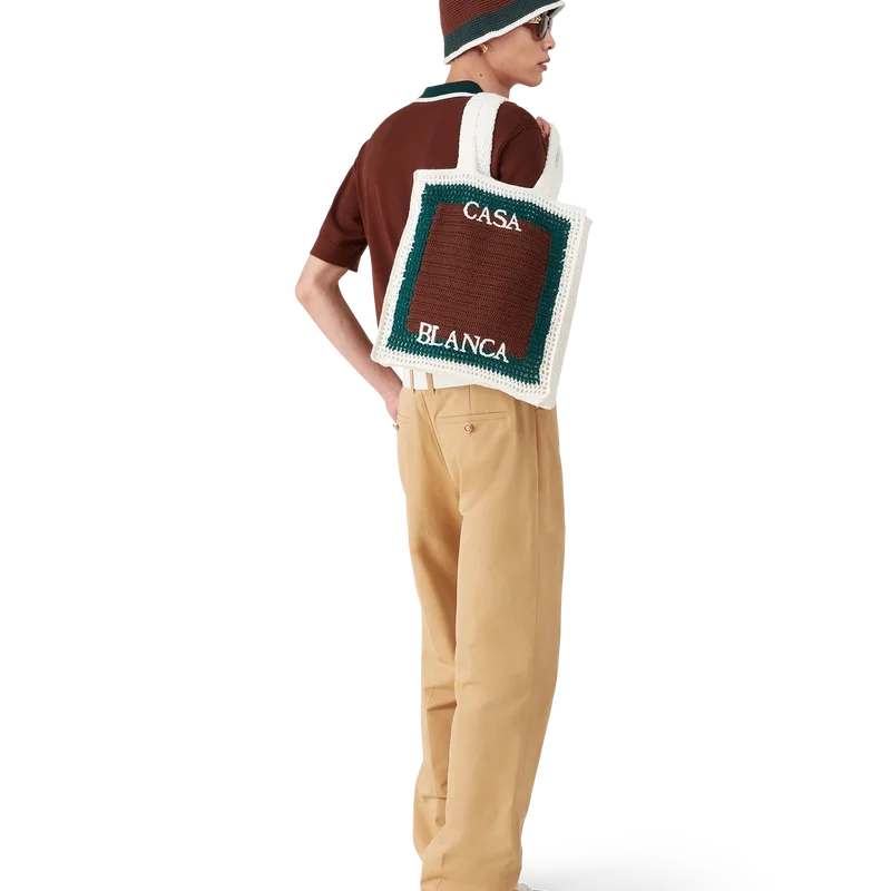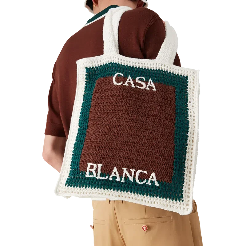 Den randiga virkade väskan är en stickad modell tillverkad av virkat bomullstyg och har en avslappnad silhuett. Den kompletteras med ett broderat staplat logo och remmar som gör att den kan bäras över axeln eller i handen.