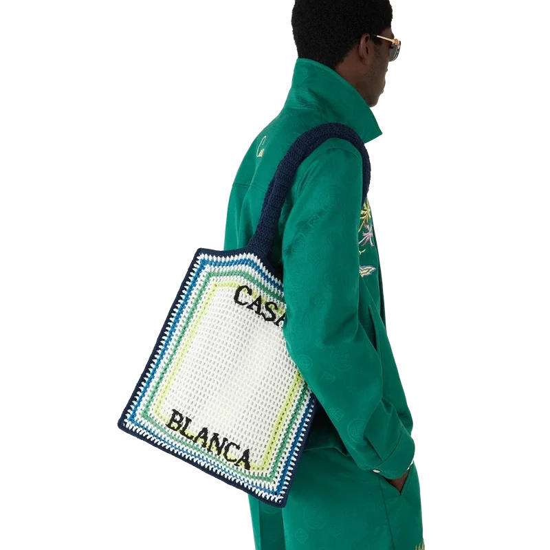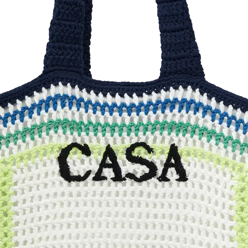 Crochet-väskan är en elegant bomullsdesign med husets staplade logotyp och randiga gröna och gula accenter. Kompletterad med remmar som gör att den kan bäras över axeln eller i handen, samt en avslappnad virkad konstruktion.