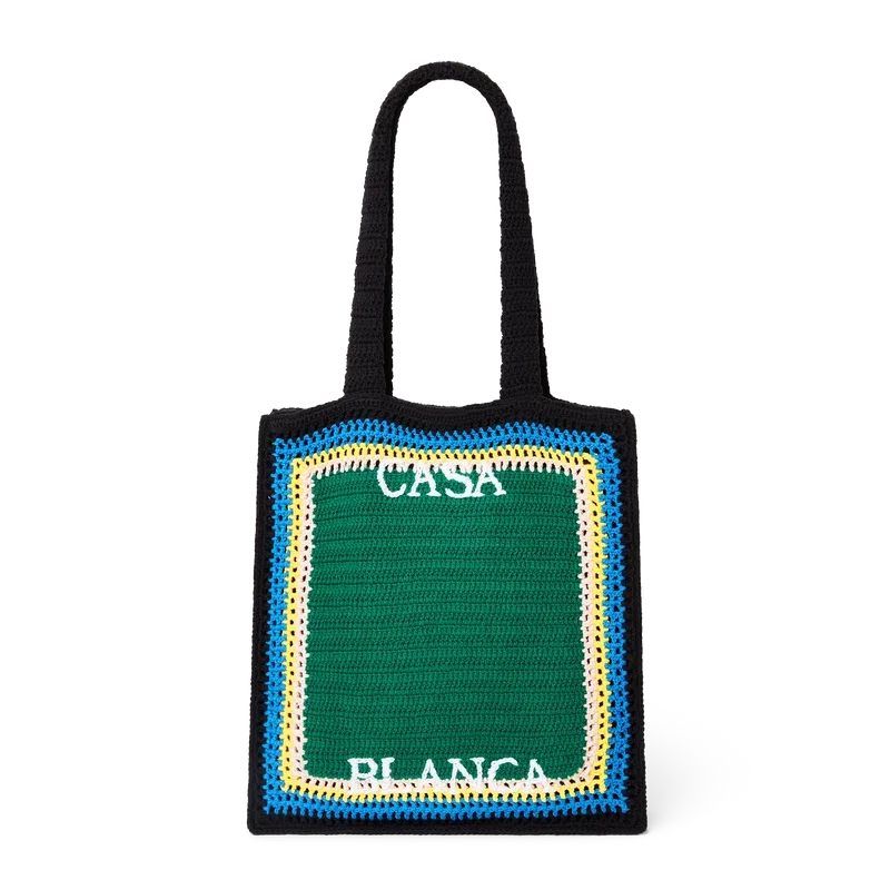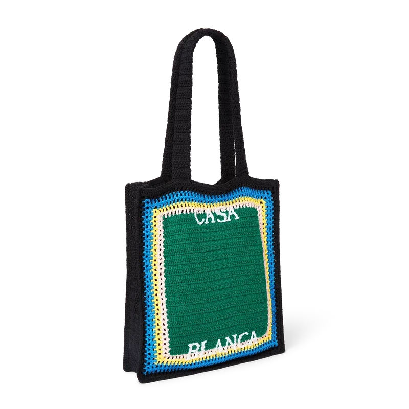 Den virkade väskan är en stickad modell tillverkad av virkat bomullstyg och har en avslappnad silhuett. Den kompletteras med ett broderat svart logo och remmar som gör att den kan bäras över axeln eller i handen.