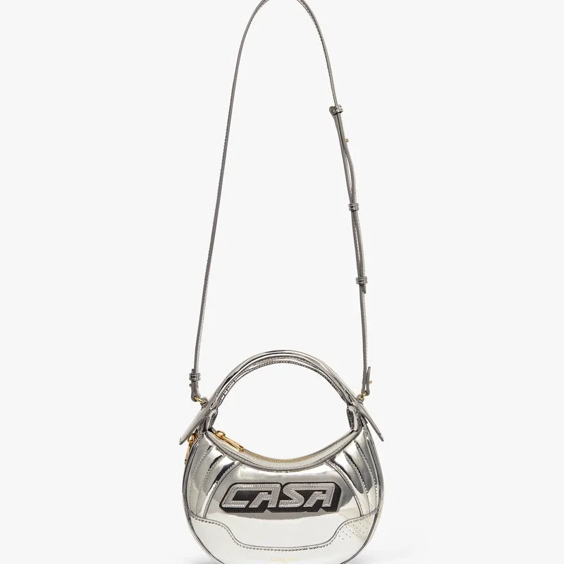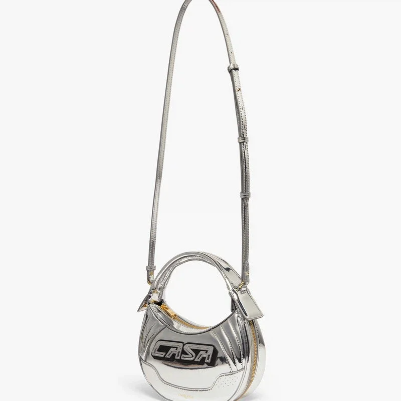 Silver Biker Bag är tillverkad i läder och har märkets Casa-inskription på framsidan. Den kompletteras med en rem, dragkedja, detaljer i form av dragkedjor, guldpläterade beslag och en rundad silhuett. Levereras med en presentask, en dammpåse med märkeslogotyp och en produktbroschyr.