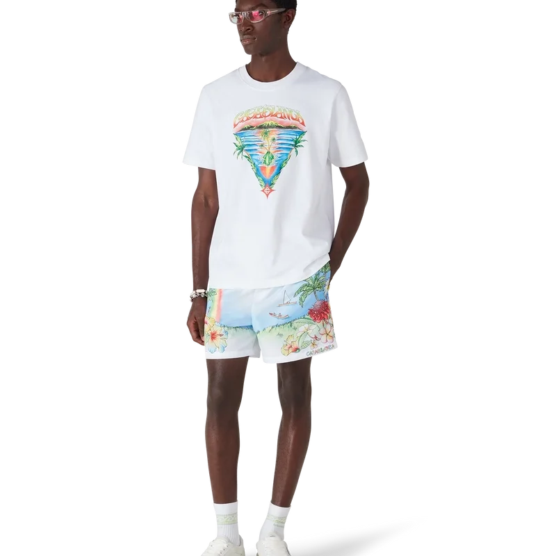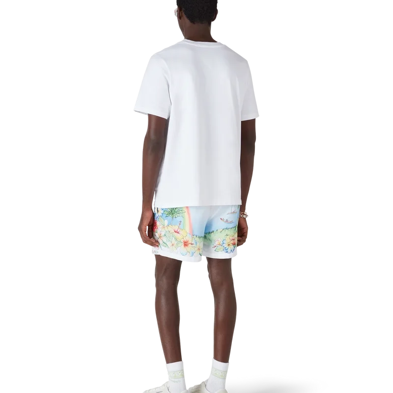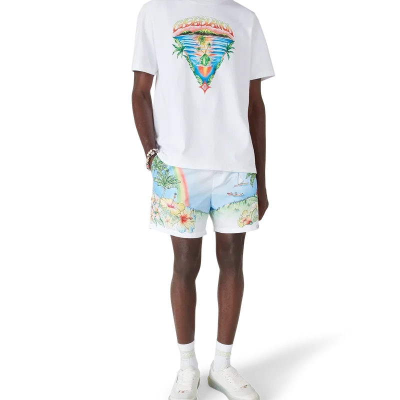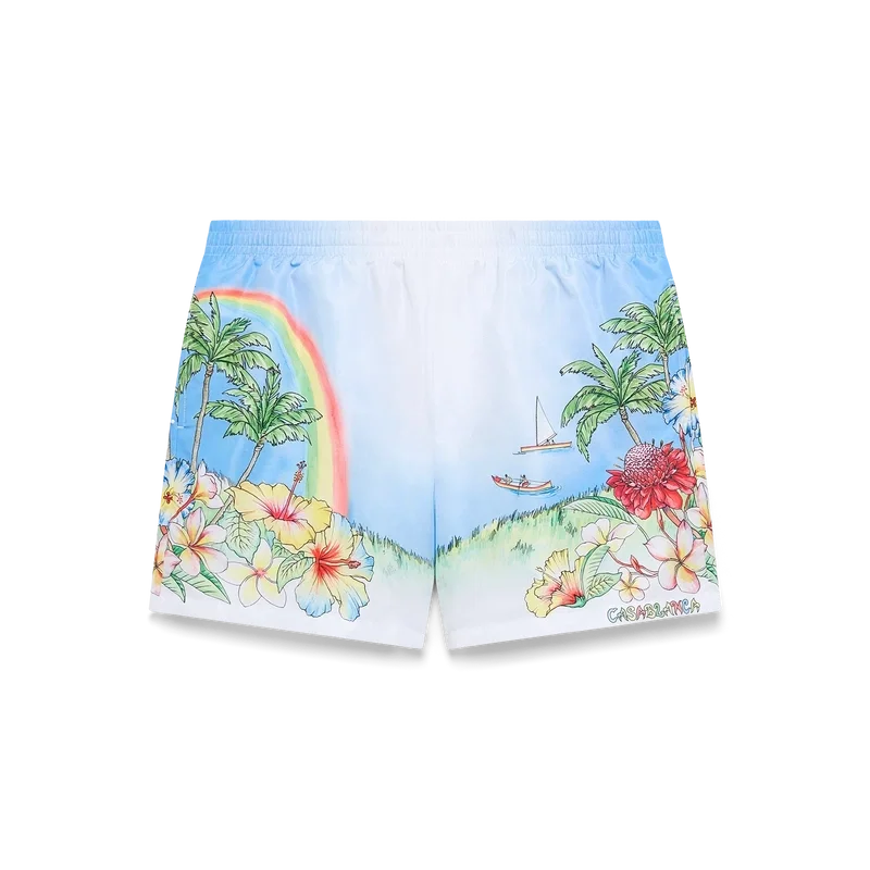 Aloha-shortsen med tryck har en raffinerad teknisk design med en livfull, målad avbildning av Kauai, Hawaii, som visar dess bergiga paradis, vattenfall, lekfulla delfiner, kanoter och en regnbåge, med en överdriven vy av landskapets skönhet. Kompletterade med en elastisk midjeresår, sidfickor och en konstruktion i tekniskt badtyg som fångar varumärkets lyxiga sport- och fritidskod.