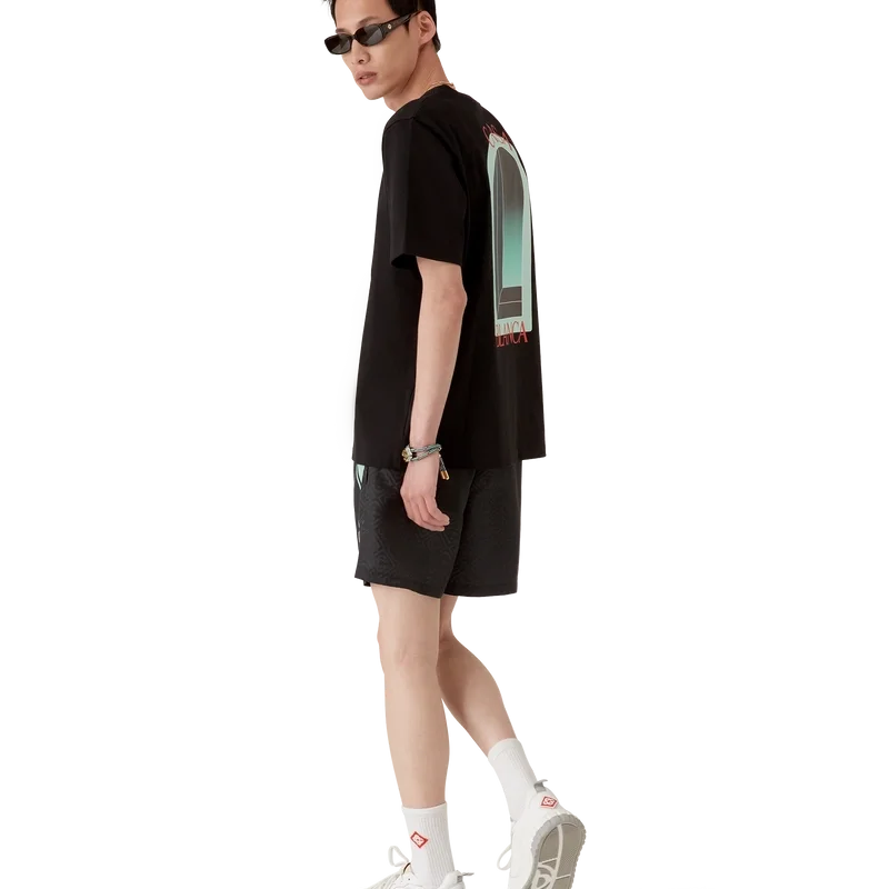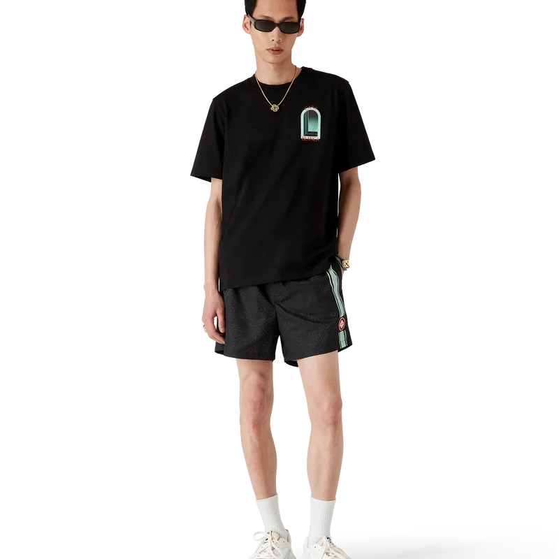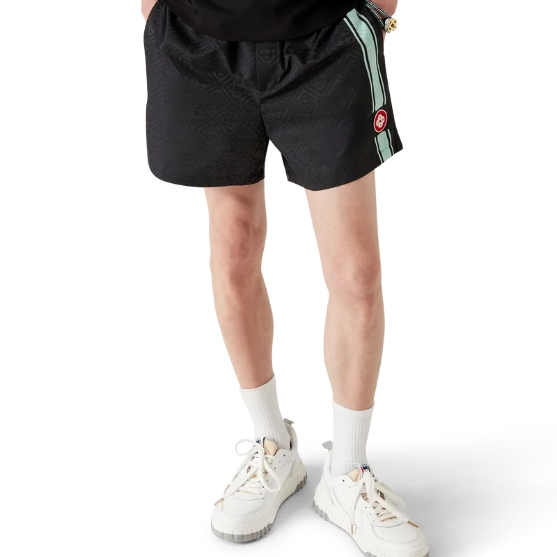 Badshortsen med jacquardrand är heltäckande tryckta och tillverkade av ett andningsbart polyestertyg. De har en elastisk midjeresår, en inre dragsko, sidofickor i sömmarna, en innerficka och foder.