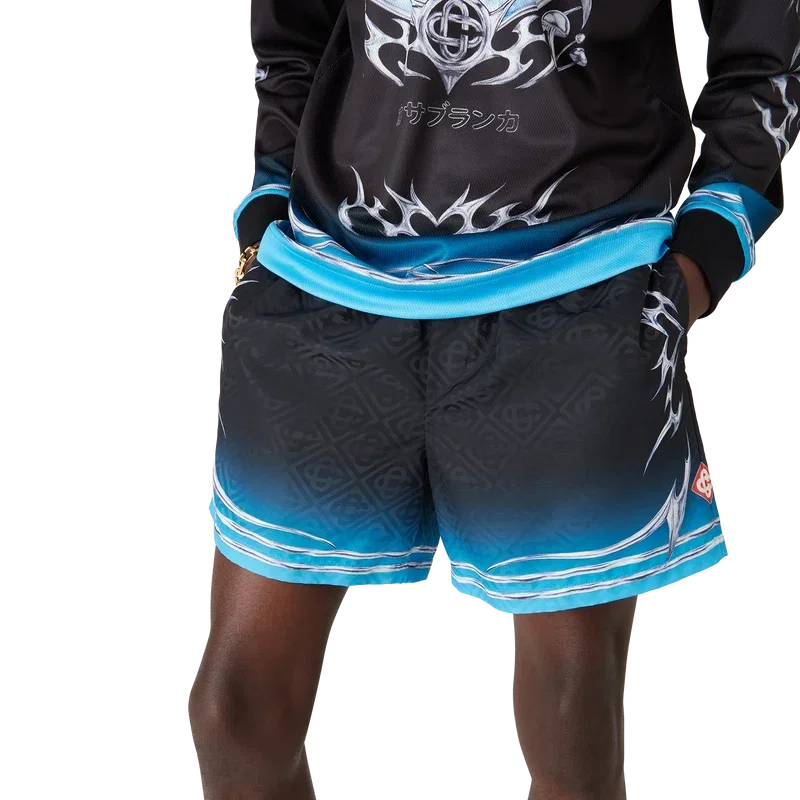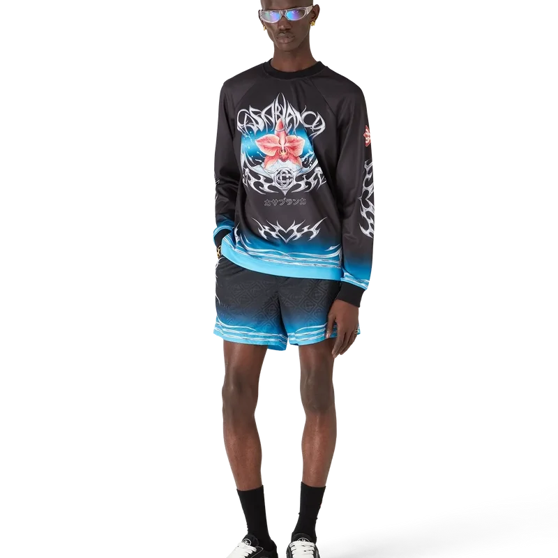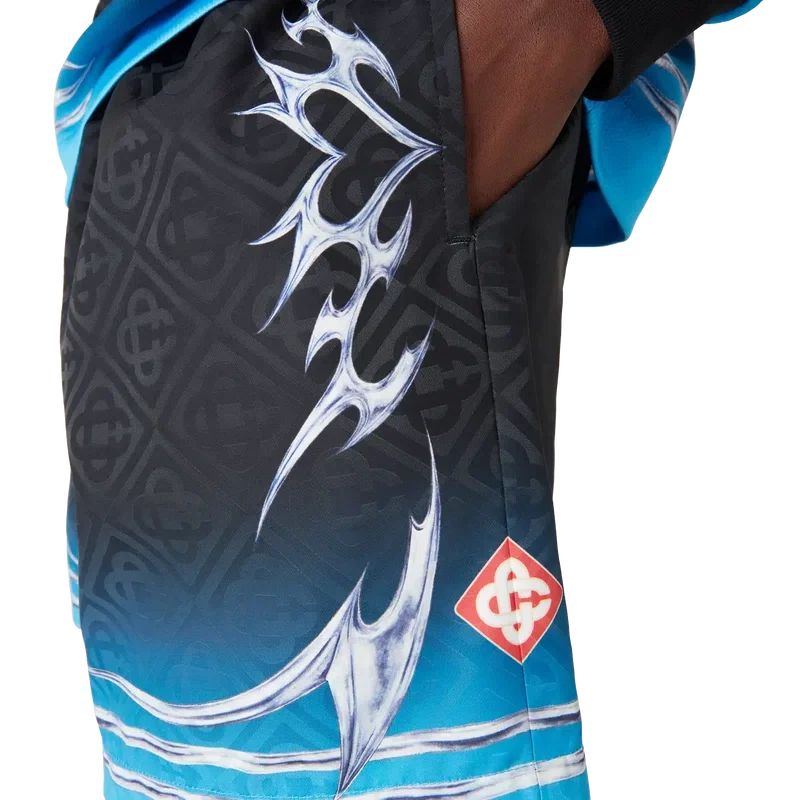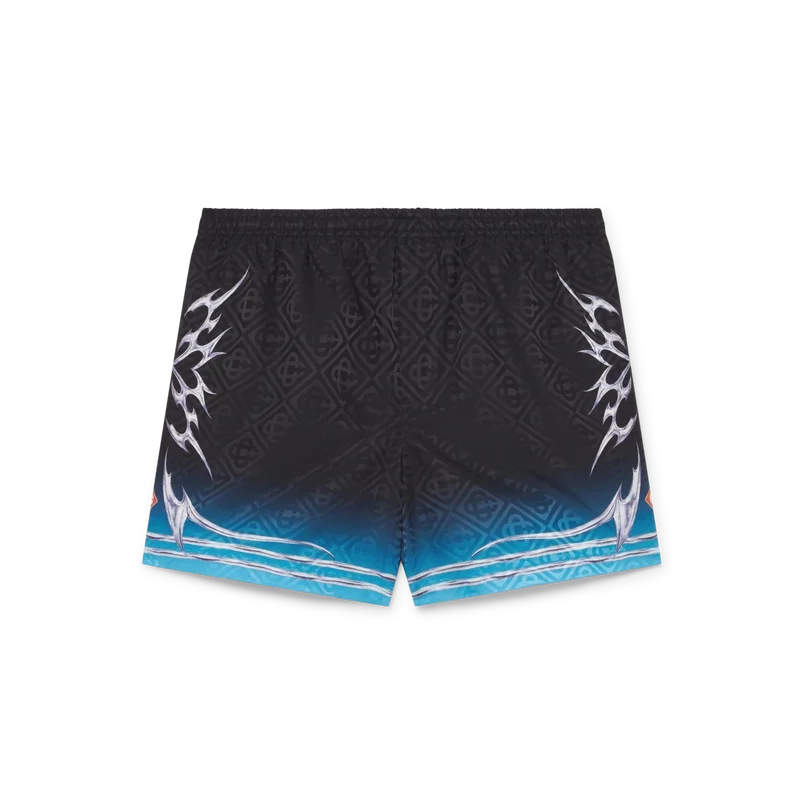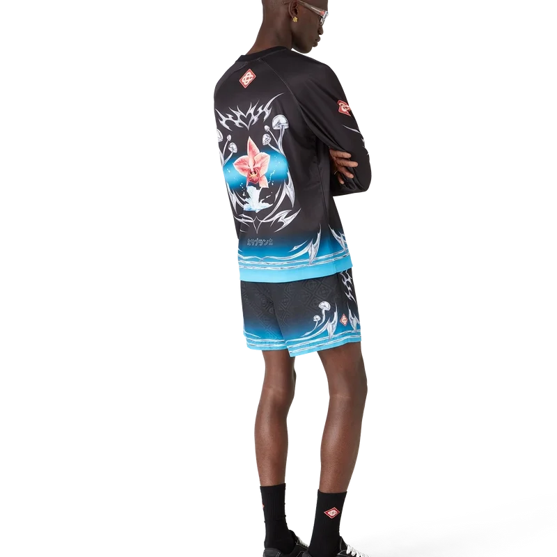 Blades Jacquard-shorts har ett tryckt mönster med konstverk som leker med kontrasten mellan två motsatta känslor – bladets skärpa och den kalla, silverkromade ytan, i kontrast till naturens värme, som de djärva rosa och röda tonerna i en orkidéblomma. Vattnet tillför ett friskt och fräscht inslag till designen. Försedda med elastisk midja, invändig dragsko, meshfoder och en innerficka.
