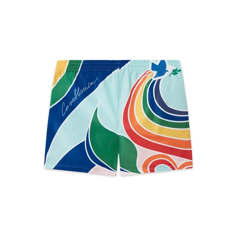 Le Pouvoir Des Fleurs badbyxor är en sommarfavorit tillverkad av tekniskt polyestertyg med säsongsbetonat tryck som kombinerar Casablanca-symbolik med arabisk ikonografi. Kompletteras med elastisk midja, dragsko och sidfickor.