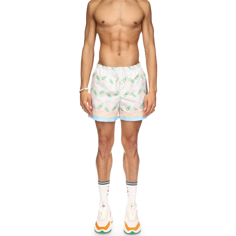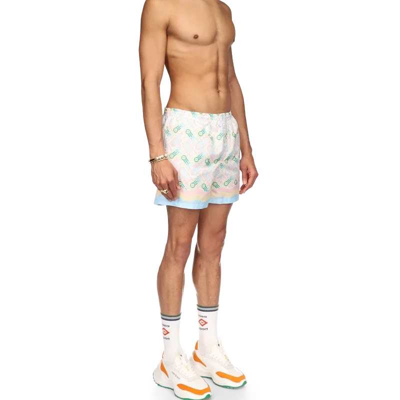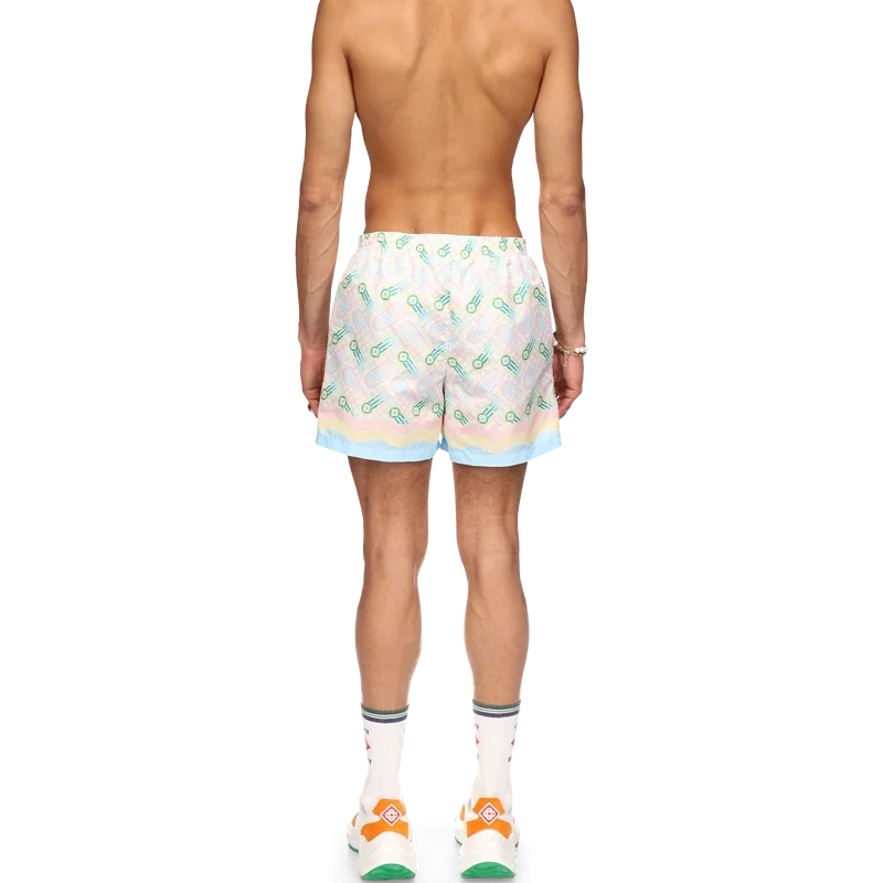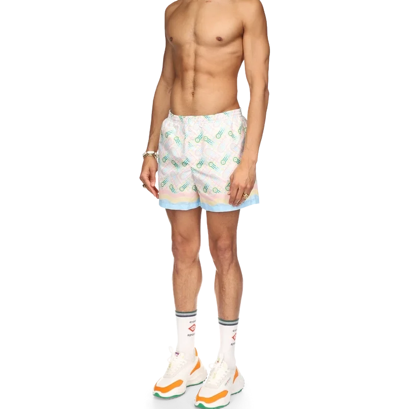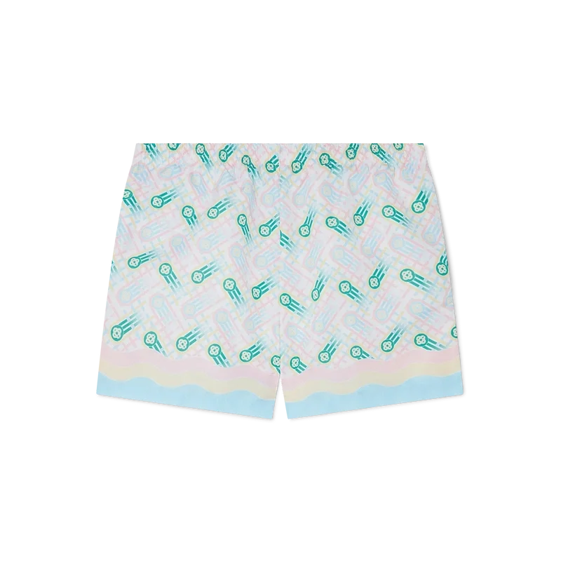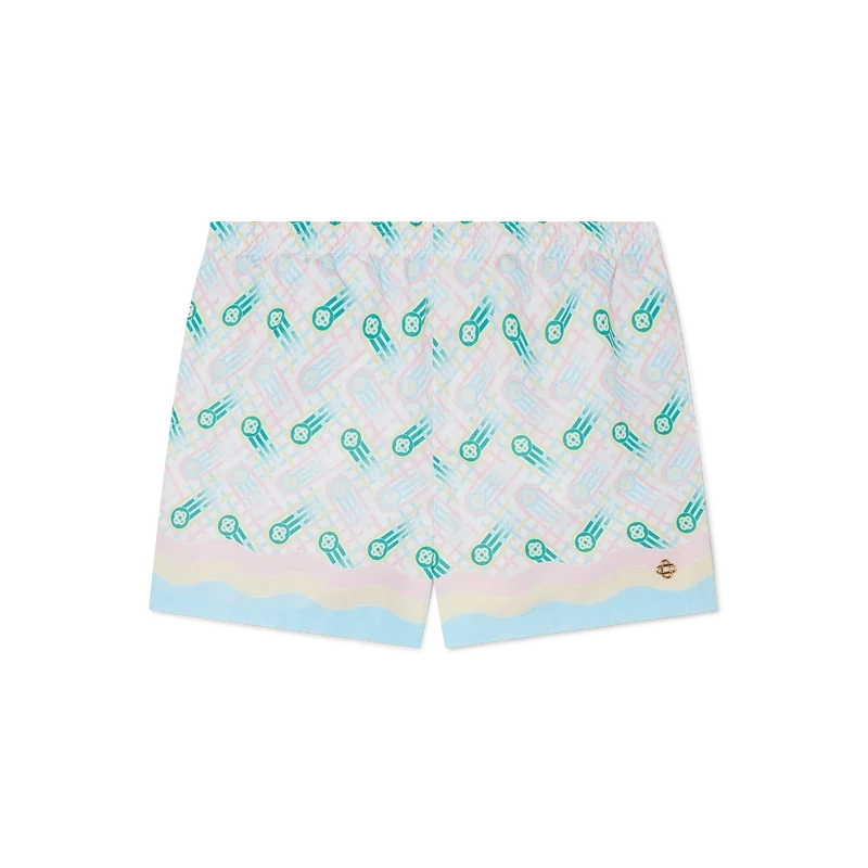 Ping Pong-badbyxorna har ett tryckt mönster inspirerat av husets tidigare Japan-kollektion, med en pingisboll i rörelse och en fålldetalj inspirerad av Memphis-vågen. Tillverkade i polyestertyg med elastisk midjeresår, sidfickor och foder. Plagget kompletteras med en Casablanca-märkesetikett.