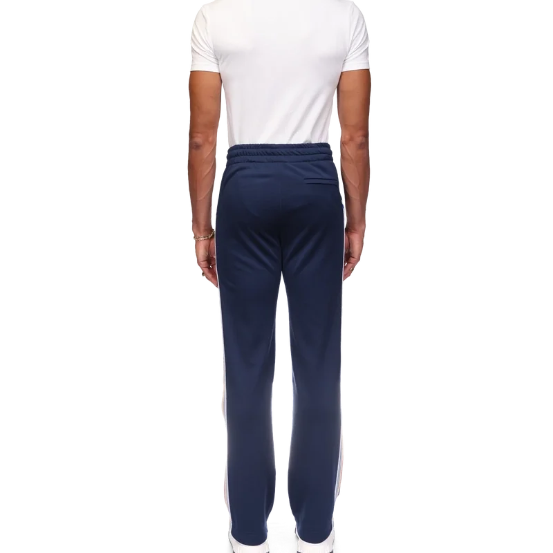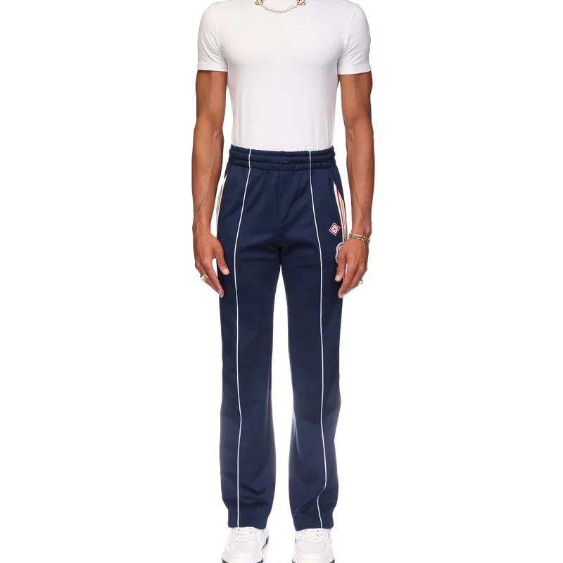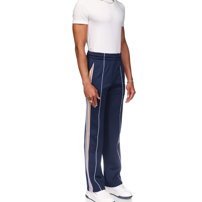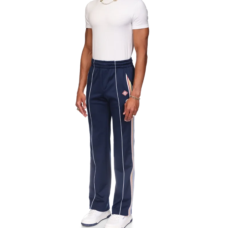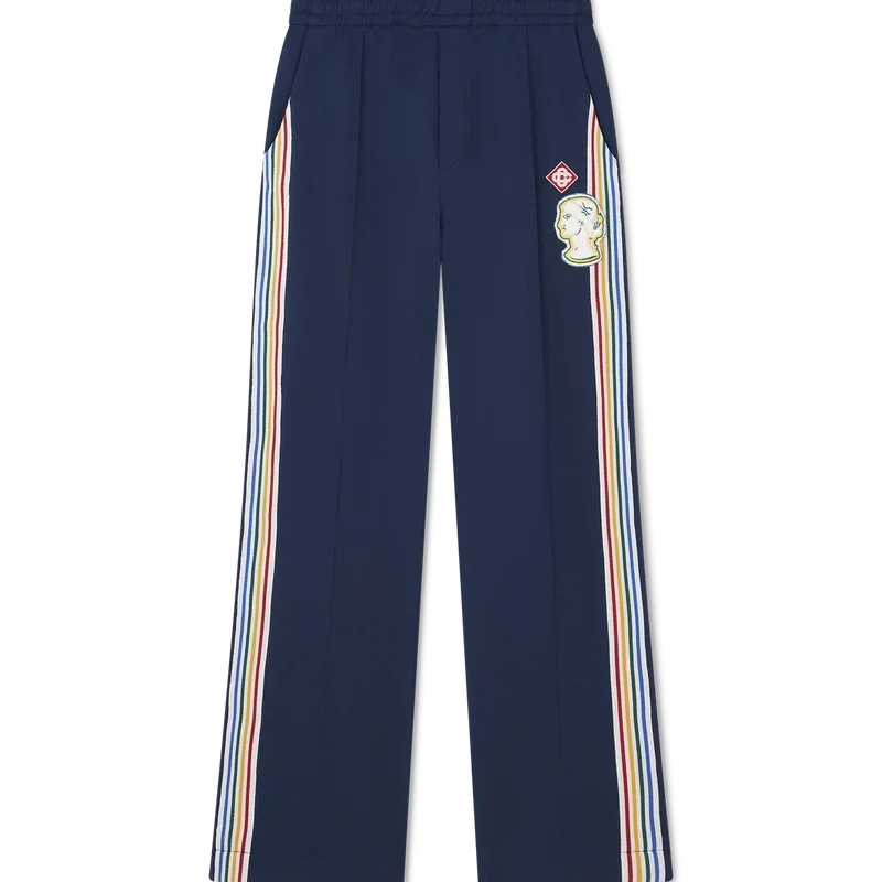 Varsity-träningsbyxorna har raka ben och en sportinspirerad design i trikåtyg. De har en elastisk midja med dragsko, snedställda sidfickor, vita ränder längs framsömmarna och flerfärgade ränder längs sidorna.