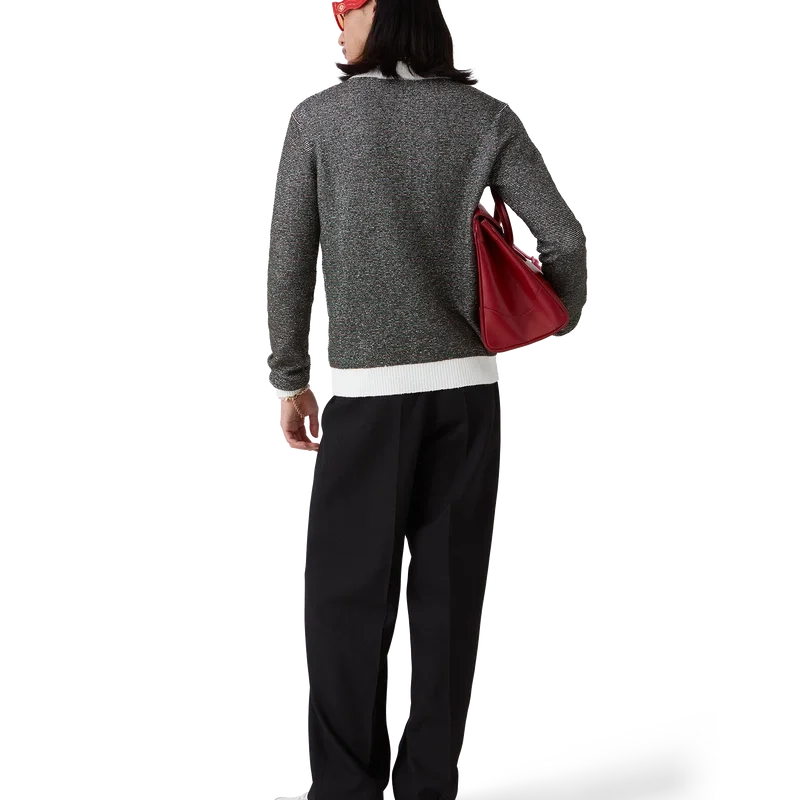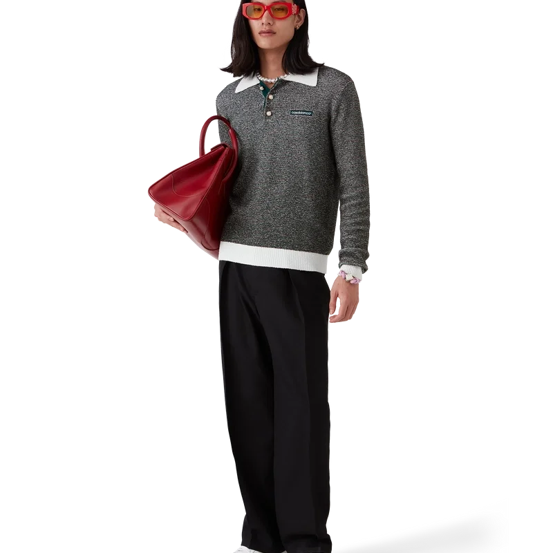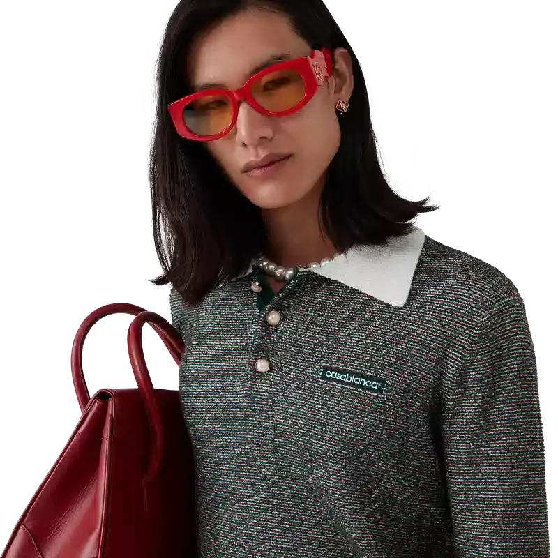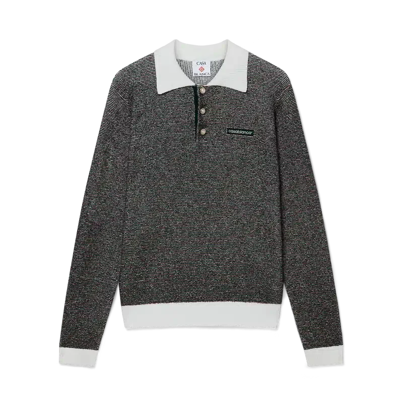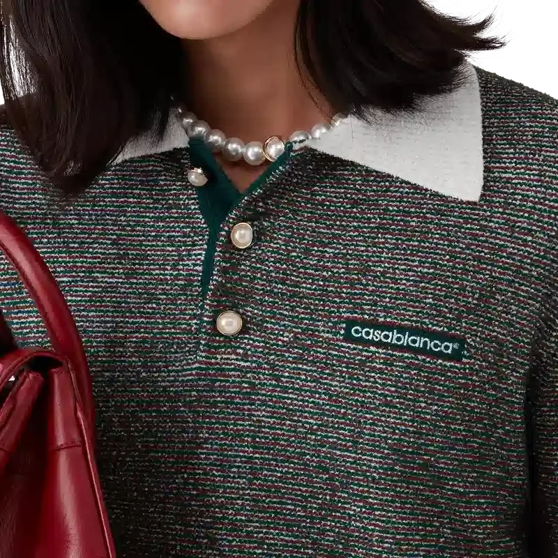 Pikétröja med bouclé-ränder är en långärmad modell tillverkad av bouclé-randigt tyg med husets Casablanca-logotyp. Den kompletteras med en knäppning med tre knappar, signaturknappar med guldkant och pärlor samt kontrasterande ribbad knäppning, fåll, manschetter och krage.