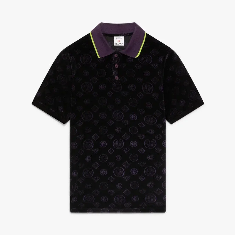 Den lila monogram-velourpikétröjan är en kortärmad modell tillverkad i velourtyg, med husets ikoniska monogrammönster över hela plagget. Den kompletteras med ett silverdiamantlogo, en ribbad krage med kontrasterande kantdetaljer, knäppning och Corozo-knappar med sammanflätade CC-logotyper.