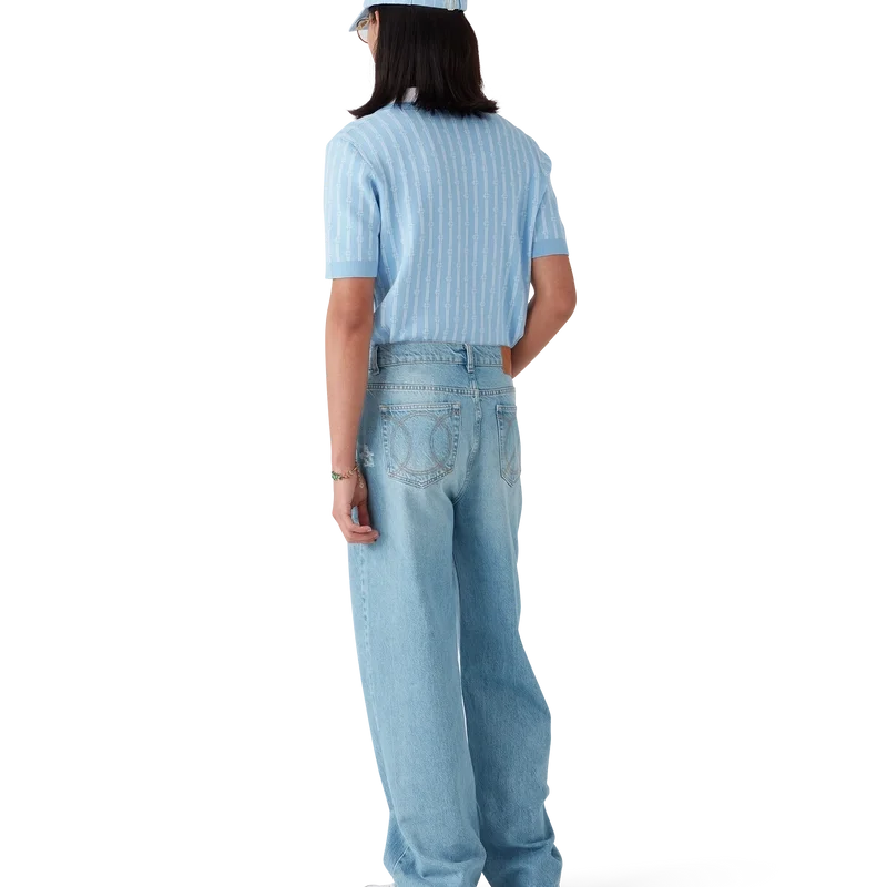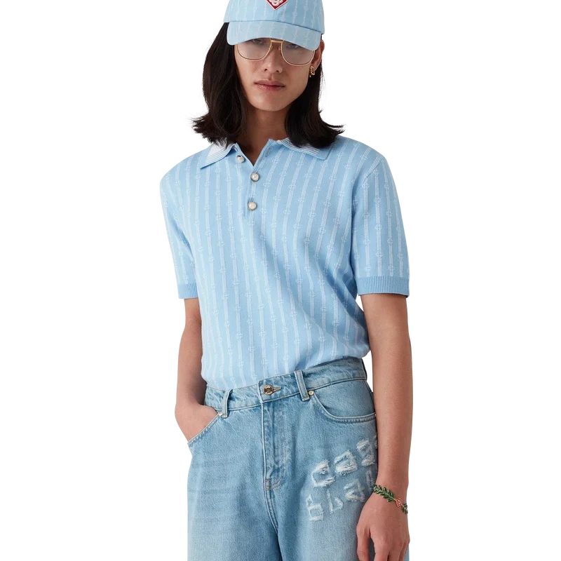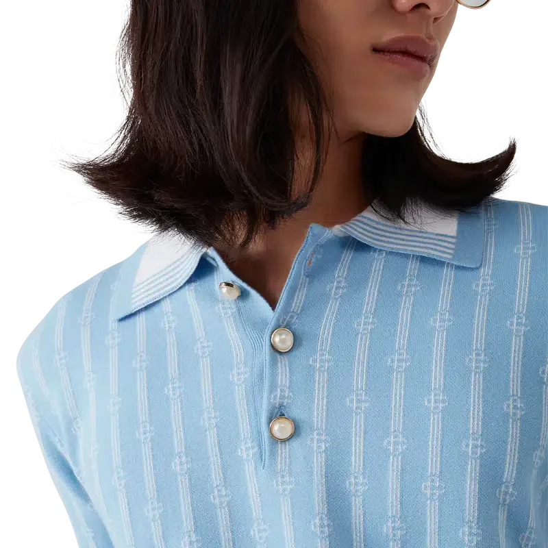 Monogram-pikétröjan är en kortärmad modell tillverkad i en bomullsblandning med en klassisk knäppning med tre knappar. Den kompletteras med husets signaturknappar med guldkant och pärlemor, ribbade muddar, fåll och krage med kantdetaljer.