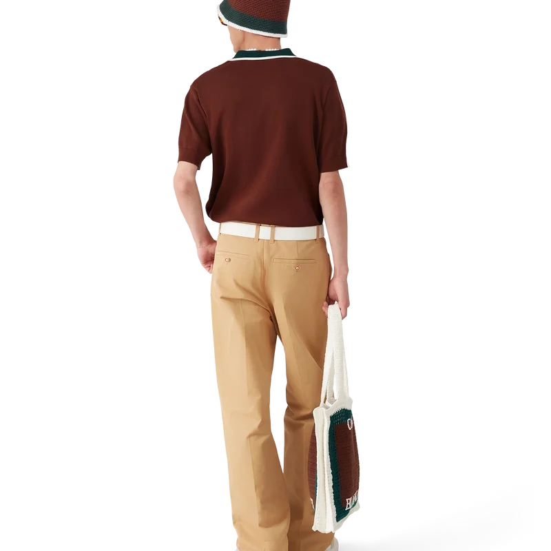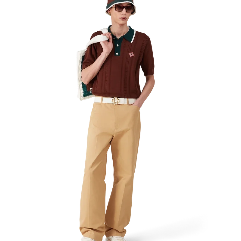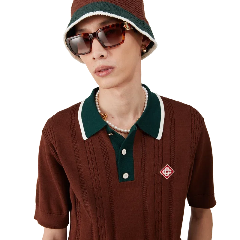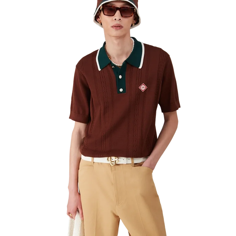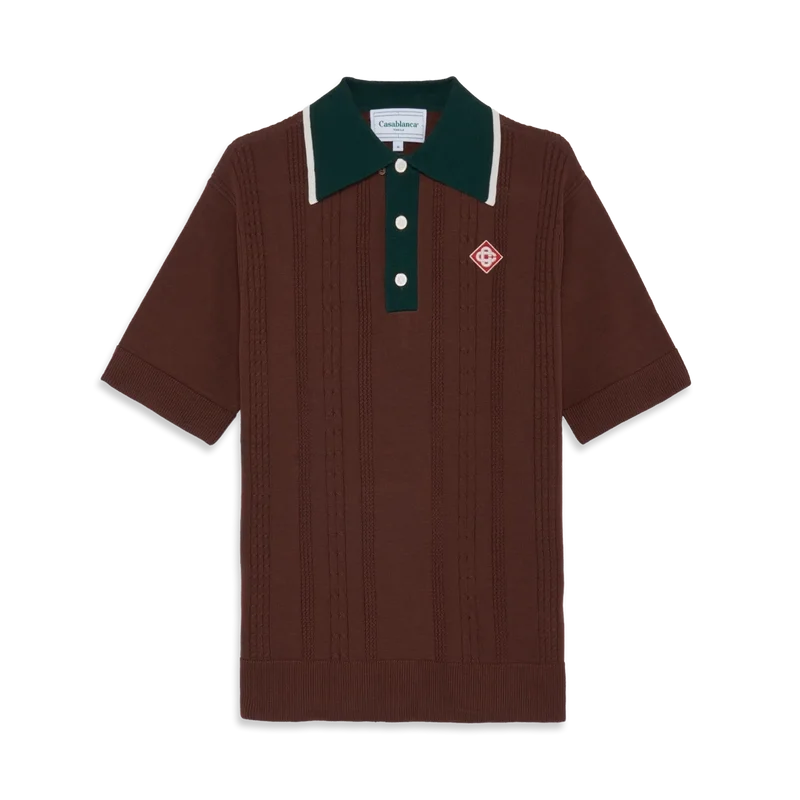 Den kabelstickade oversized pikétröjan är en kortärmad modell tillverkad av stickat bomullstyg med husets signaturdiamantlogo. Kompletterad med signaturknappar med guldkant och pärlor, en knäppning med tre knappar, en kontrasterande ribbad knäppning och en krage med kantdetaljer.
