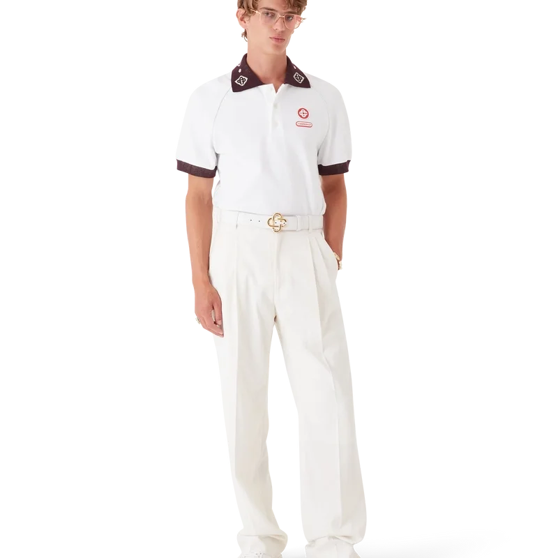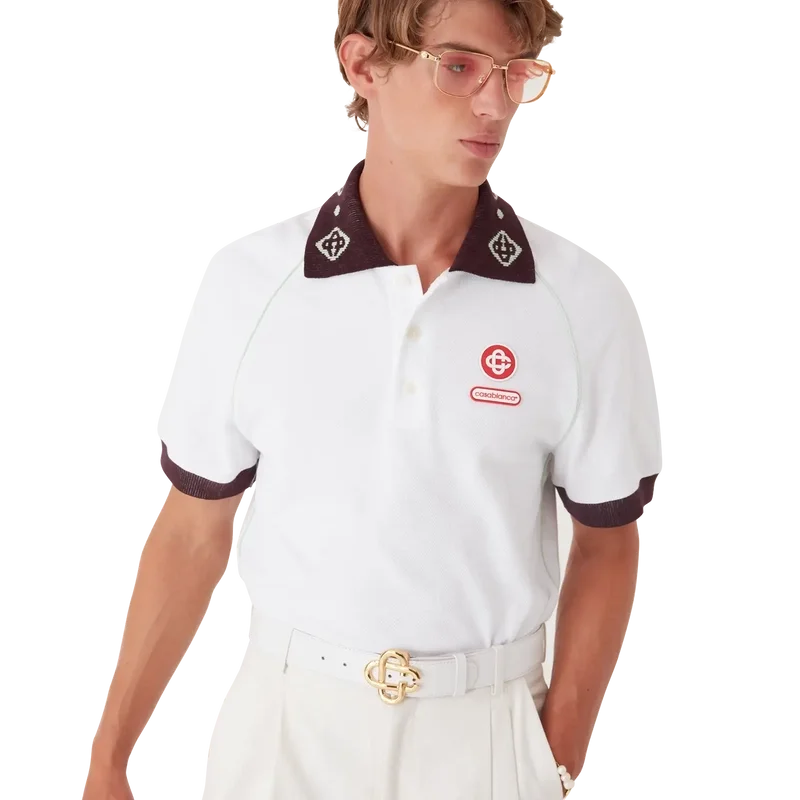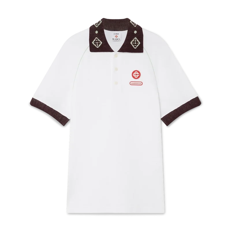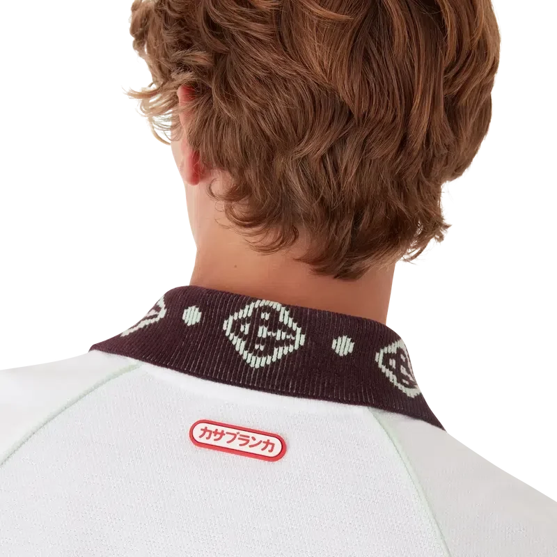 Pikétröjan har en klassisk silhuett med husets CC-logotyp och en Casablanca-logotyp i form av en lapp, tillverkad av piquétyg av ekologisk bomull. Kompletterad med en kontrasterande stickad krage med vårt signatur-CC-logo, kontrasterande manschetter, knäppning med tre knappar, raglanärmar, knappar i corozo med CC-logo samt ett Casablanca-logo under kragen skrivet på japanska.