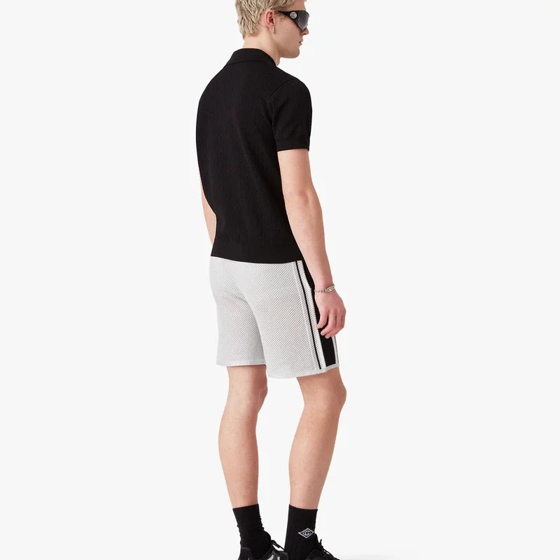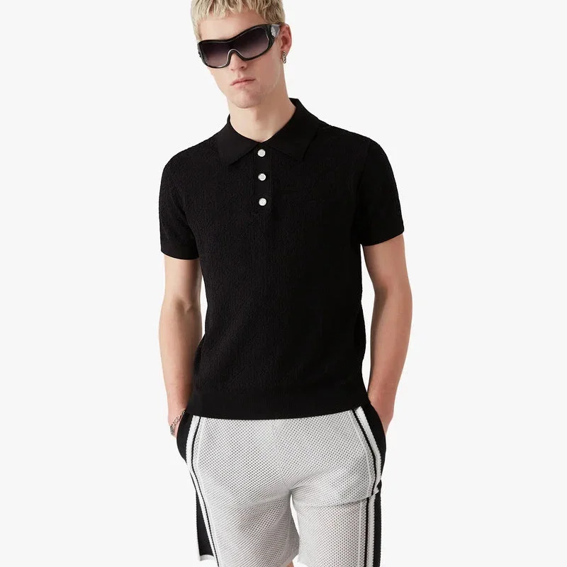 Den svarta kortärmade pikétröjan med pointelle-mönster och monogram har en elegant stickad design med en öppen pointelle-struktur och husets signaturmönster. Den kompletteras med ribbad krage och knäppning, knäppning med knappar, signaturknappar med silverkant och Cc-logotyp samt ribbade manschetter och fåll.