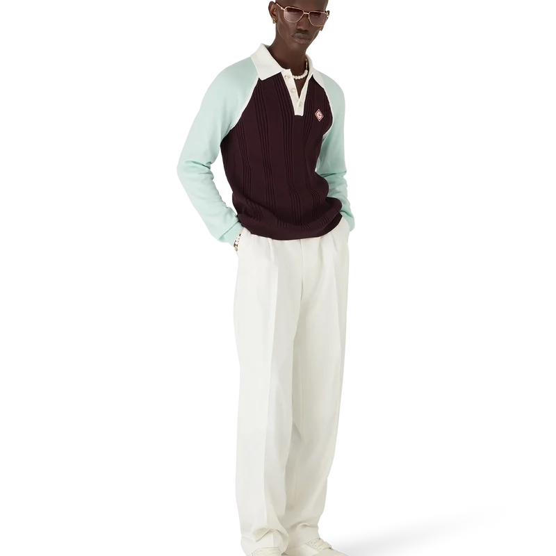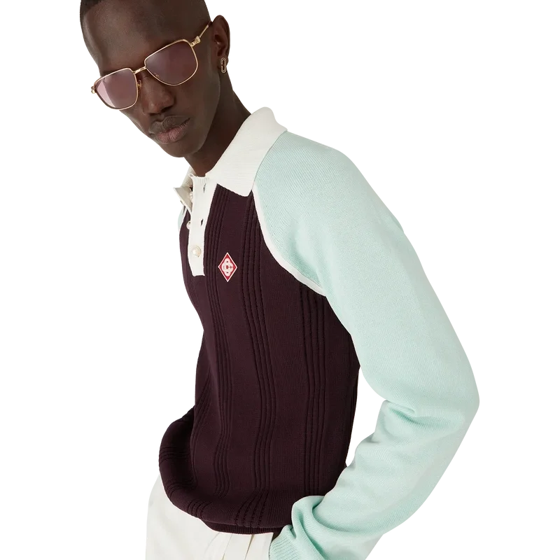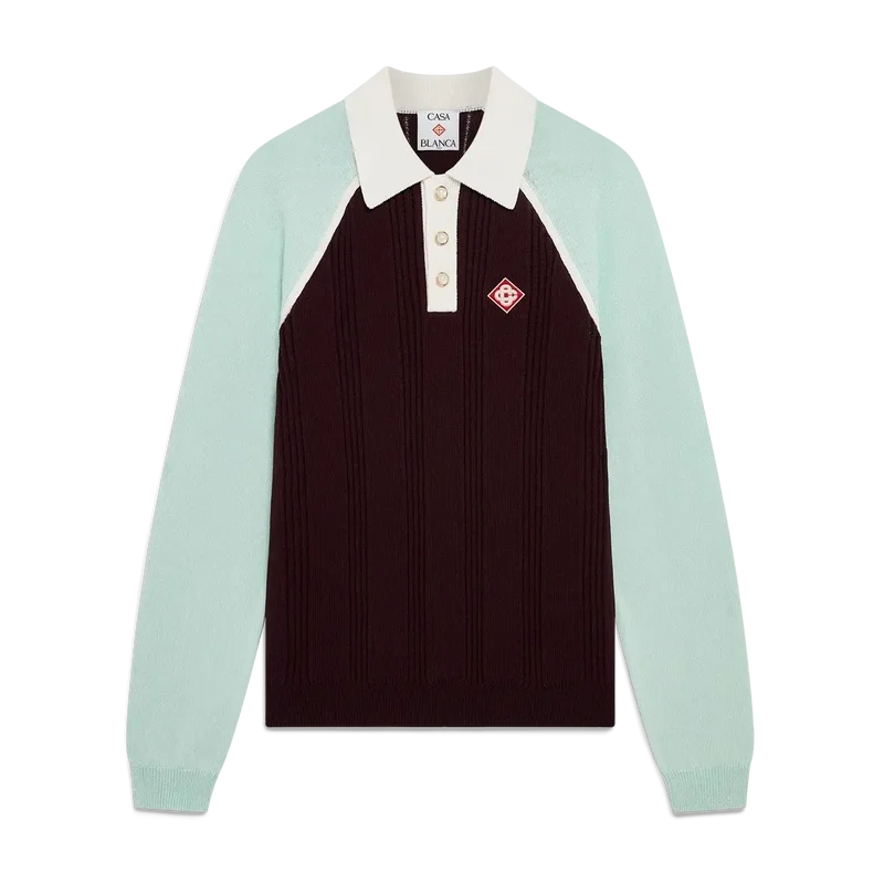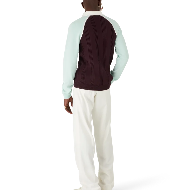 Tennis-pikétröjan med långa ärmar är en stickad modell tillverkad i bomull, med märkets signaturdiamantlogotyp. Den kompletteras med en vit ribbad krage och knäppning, knäppning med knappar, mintgröna raglanärmar och signaturknappar med guldkant.