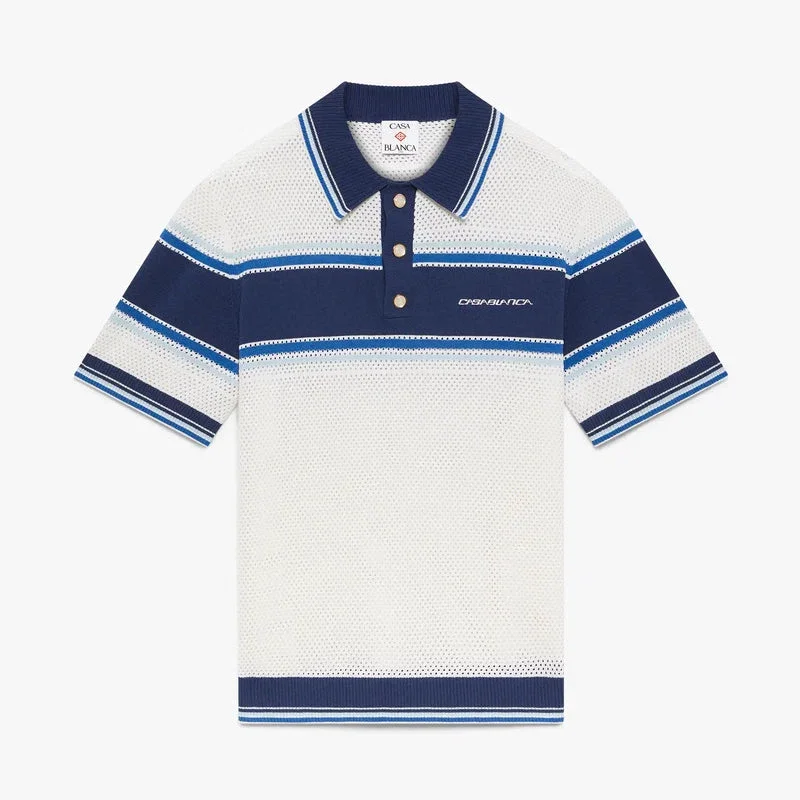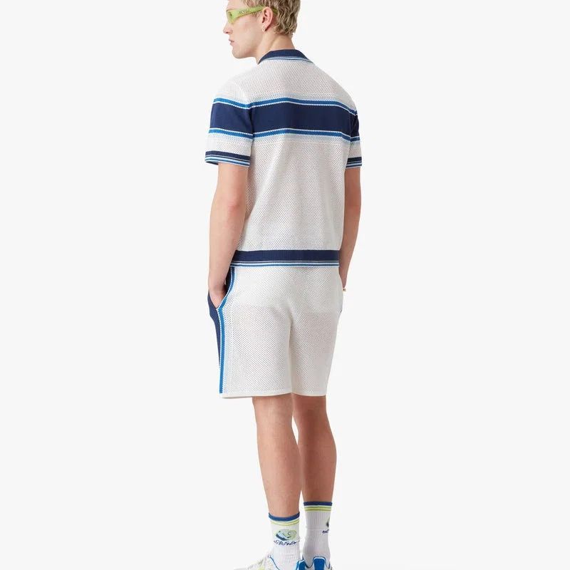 Den randiga kortärmade mesh-shortsen har en raffinerad design med blå ränder över bröstet, ärmarna och ryggen. Den kompletteras med krage, manschetter och nederkant med randiga detaljer, knäppning och signaturknappar med guldkant och pärlor.