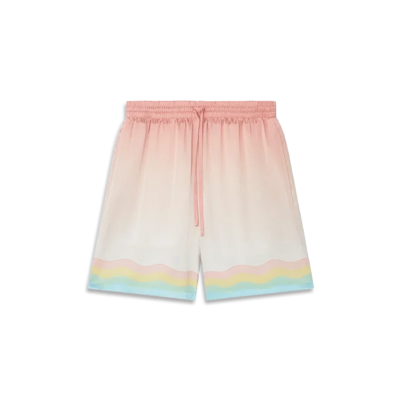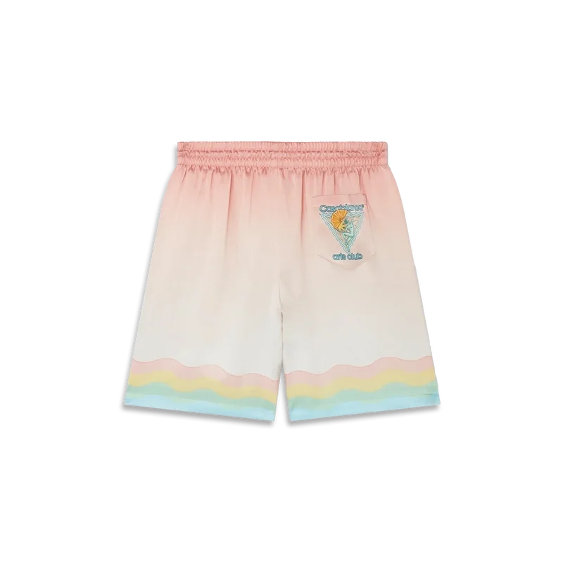 Arts Club-silkeshorts i rosa ombréfärg med säsongens konstmotiv. Avslutade med elastisk midja, dragsko och fickor på sidorna och bak som faller löst till ovanför knäet.