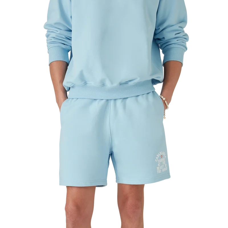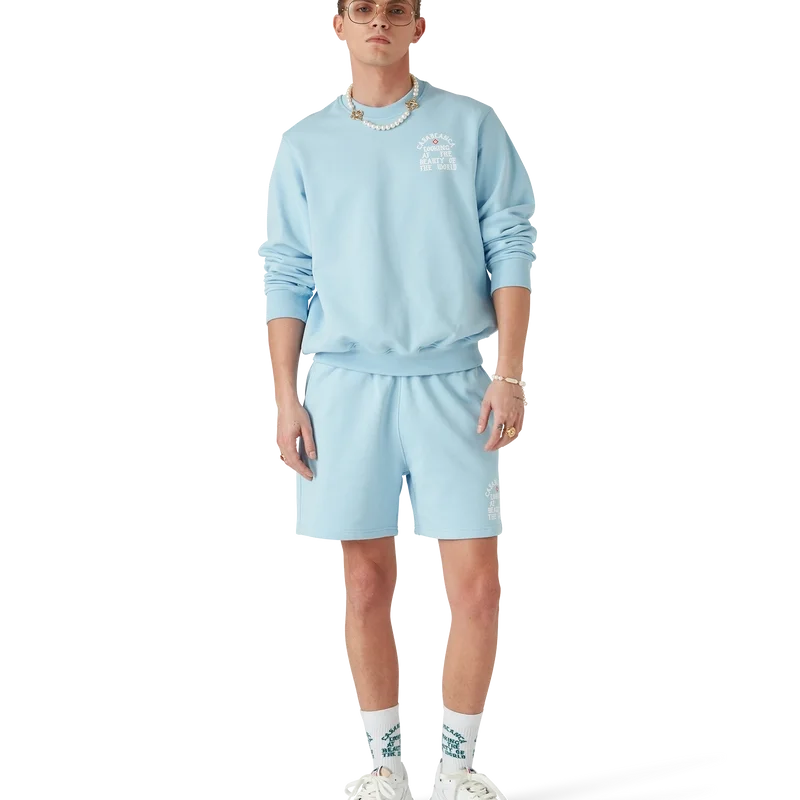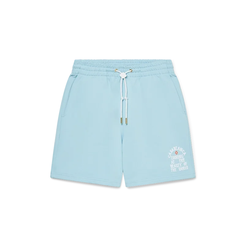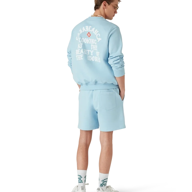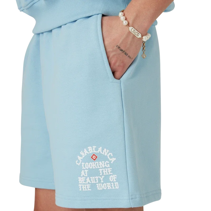 Beauty of the World-sweatshorts är ett sportplagg tillverkat av ekologisk bomull och pryds av Casablanca-märkets motto i gotisk typografi inspirerad av gatukulturen. Försedda med elastisk midja, dragsko med guldspetsar, snedställda sidfickor och en påsydd bakficka.