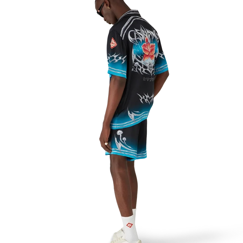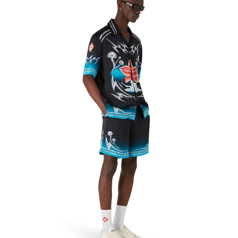 Blades Silk Satin Shorts har ett tryckt mönster med konstverk som leker med kontrasten mellan två motsatta känslor – skärpan hos bladet och det kalla, silverkromade, i kontrast till naturens värme, som de djärva rosa och röda tonerna hos en orkidéblomma. Tillägget av vatten ger designen ett friskt och fräscht inslag. Kompletteras med elastisk midja, dragsko, fickor i sidorna och en påsydd ficka bak.