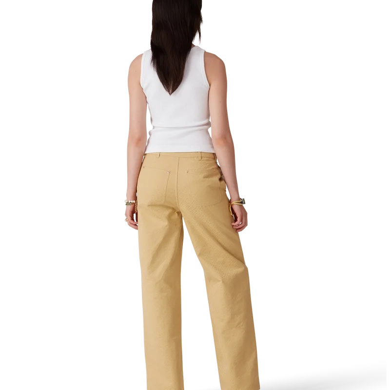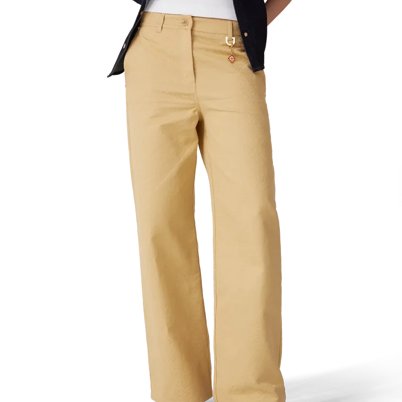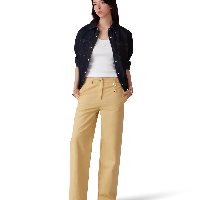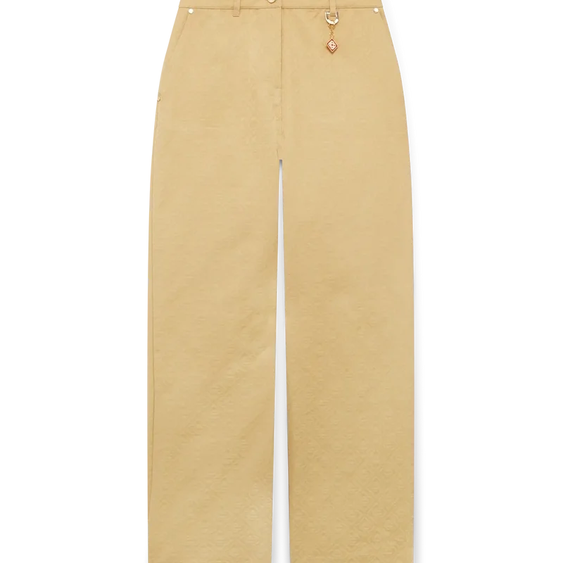 Bomullsbyxorna med monogramjacquard har raka ben och är försedda med husets signaturmönster, det sammanflätade CC-monogrammet, tillverkat av bomullsjacquardtyg. De kompletteras med dragkedja, midjeband, bälteshällor med D-ring och signaturdiamantlogotyp, guldpläterade detaljer med märkeslogotyp, snedställda framfickor och påsydda bakfickor.