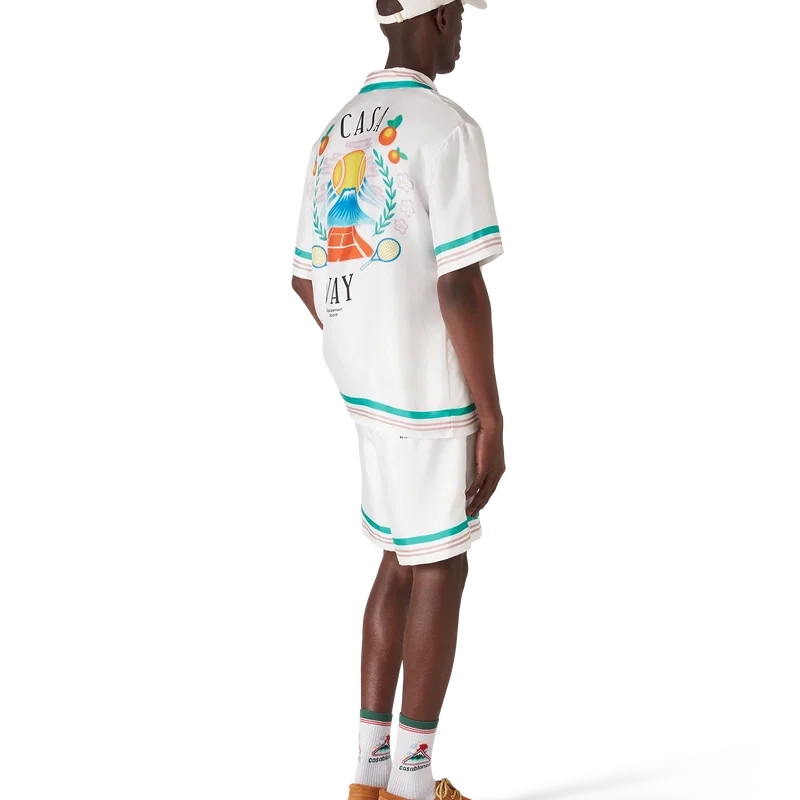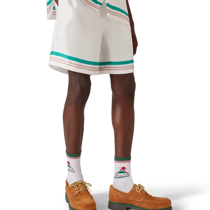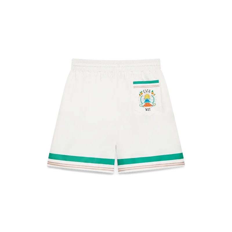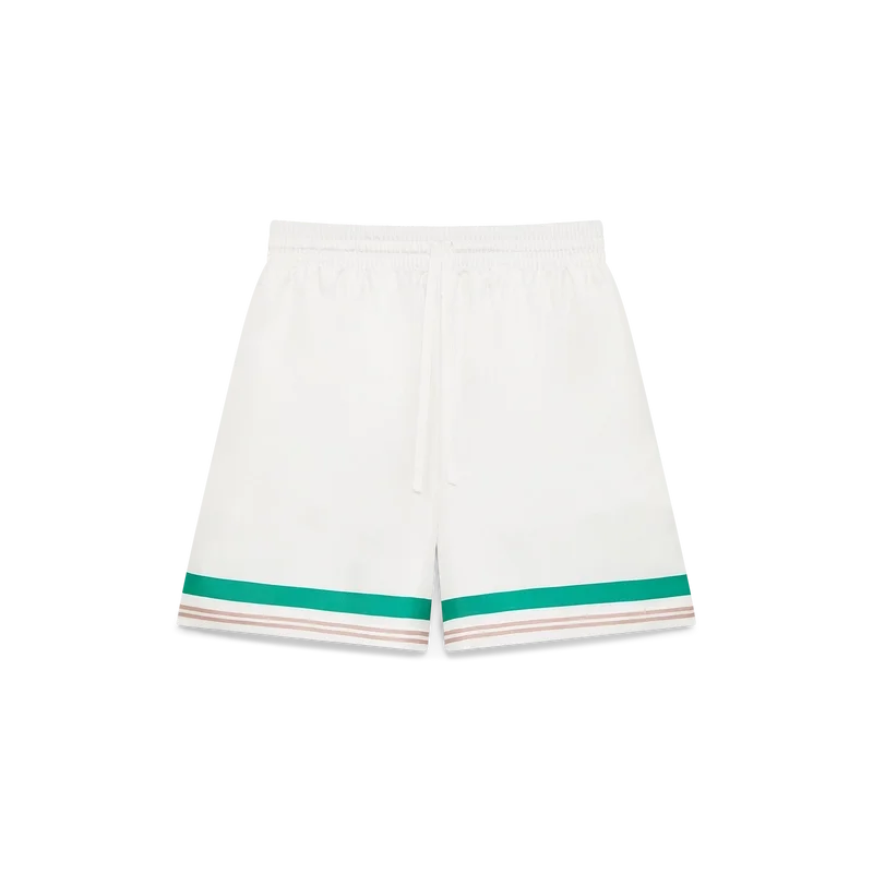 Casa Way-silkeshortsen har ett tryckt mönster och är tillverkade i silketwill. De har elastisk midja, dragsko, sidofickor i sömmarna, en bakficka samt randiga detaljer vid fåll och fickor.