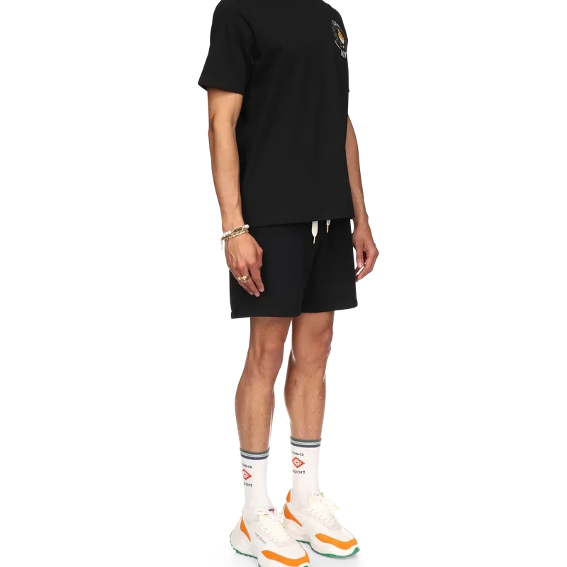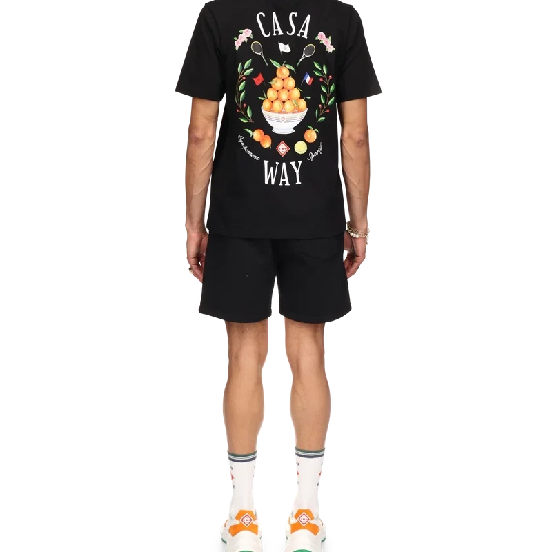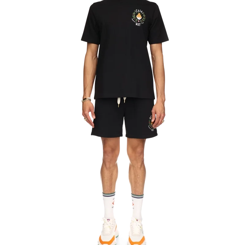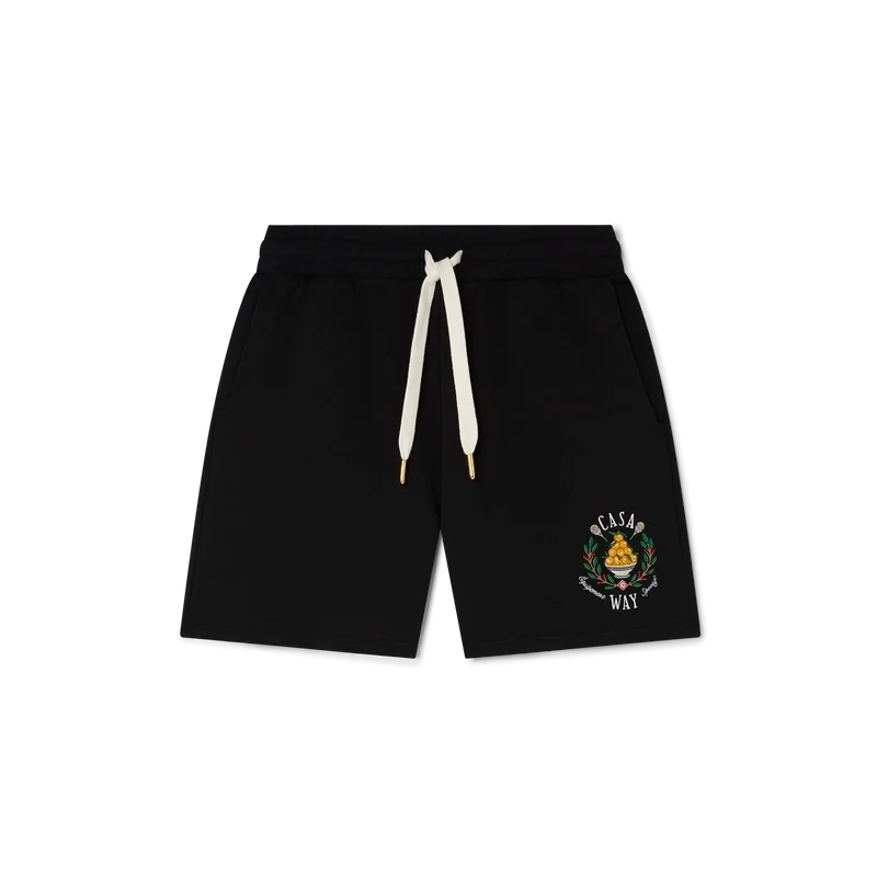 Casa Way-sweatshortsen är tillverkade i ekologisk bomull och pryds av husets signaturmotiv med broderade illustrationer av sportutrustning och blommiga detaljer som tolkats på nytt för säsongen. De kompletteras med dragsko med gulddetaljer, snedställda sidfickor och en bakficka.