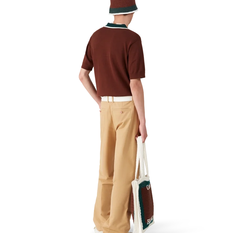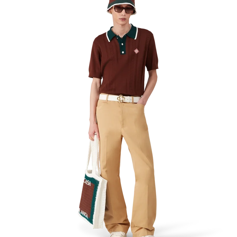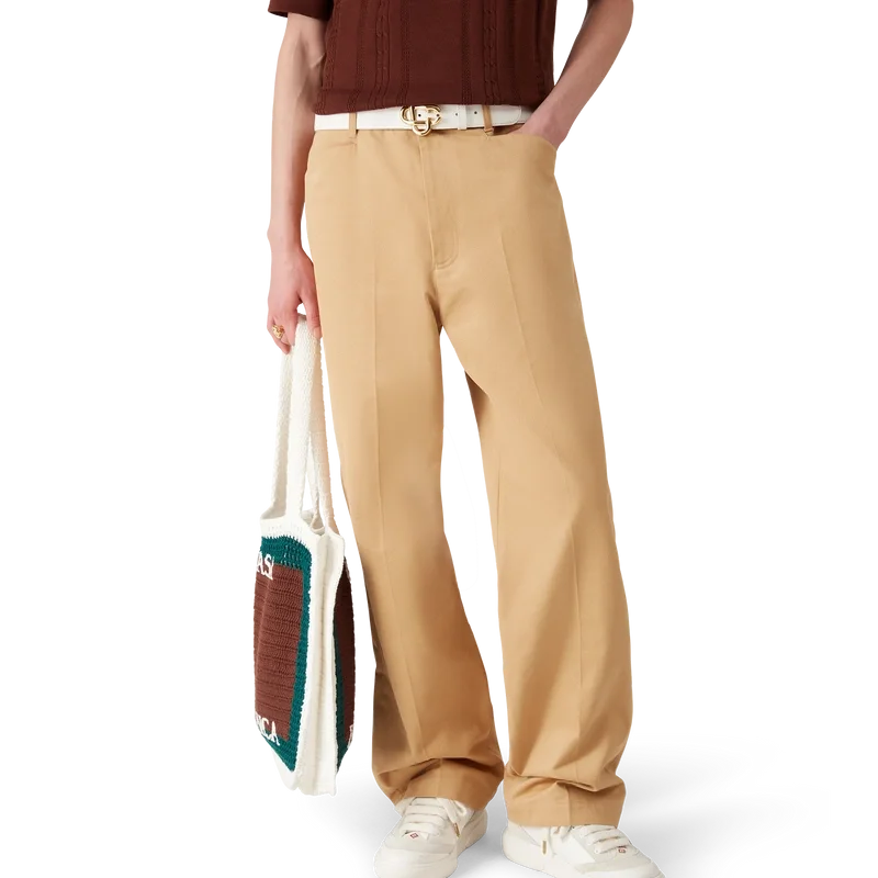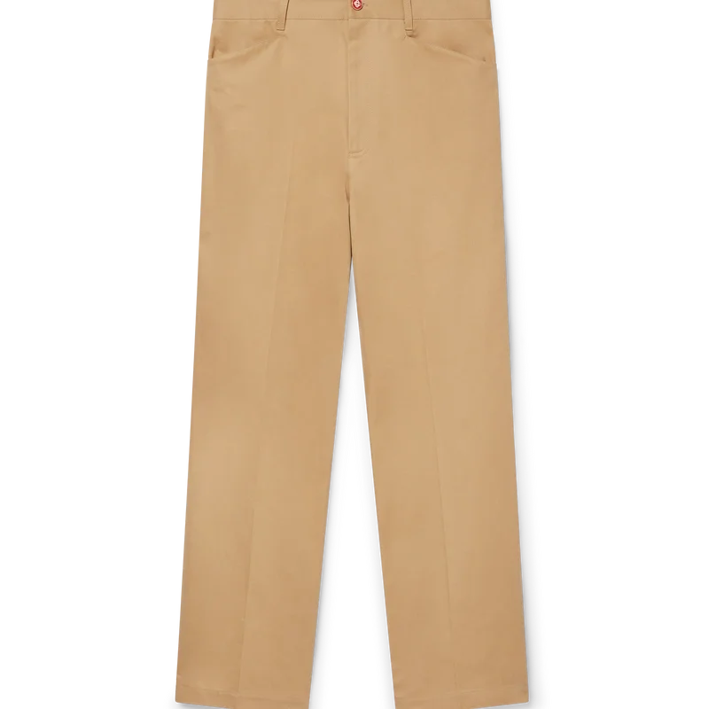 Bomullschinobyxorna har raka ben och är tillverkade av bomullstwill med bomullsfoder. De har bälteshällor, dragkedja, framfickor och bakfickor med kantband samt knappar med Cc-logotyp i guldkant.