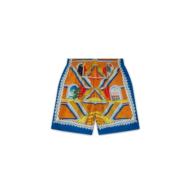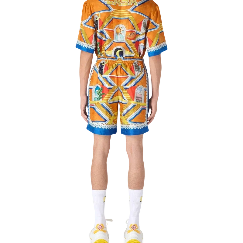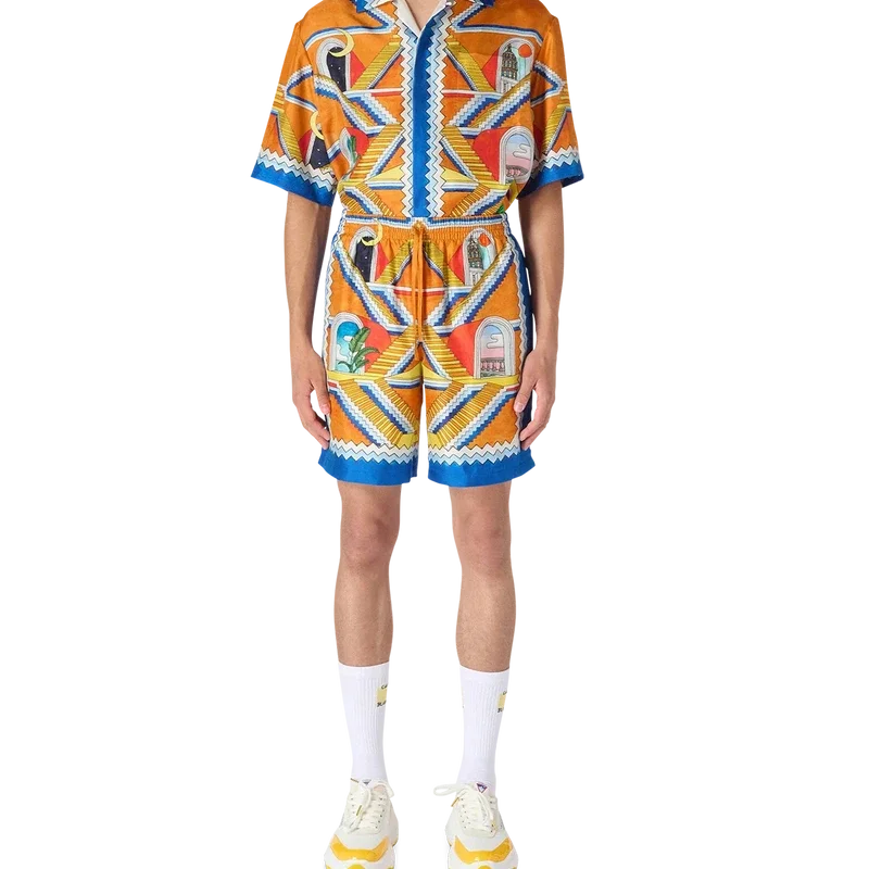 Escalier Infini silkeshorts för män har säsongens strålande konstverk med en oändlig trappa. Avslutade med en kontrasterande blå och vit zigzag-kant och dragsko i midjan.