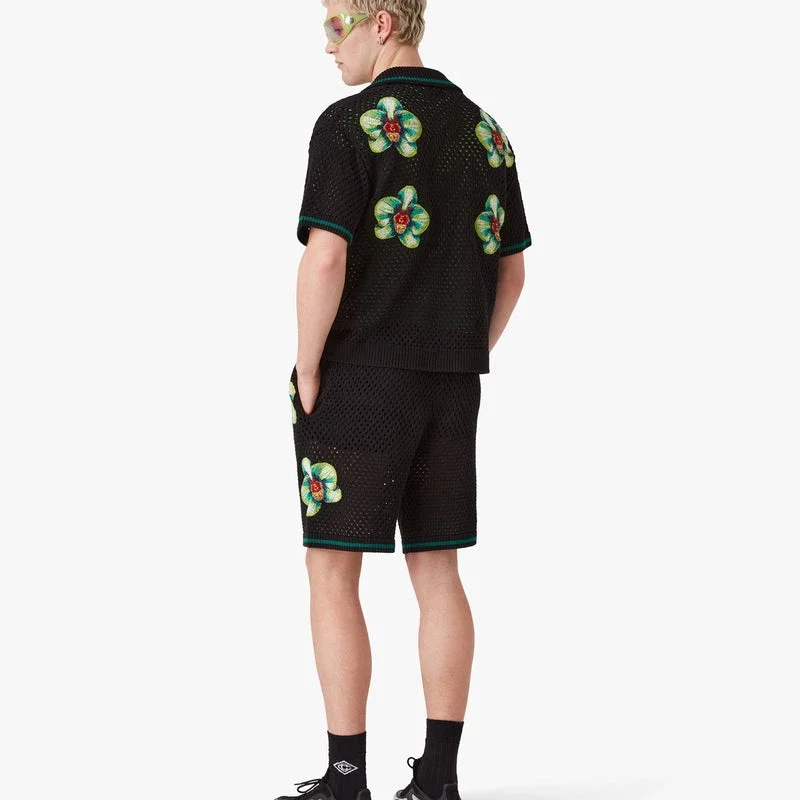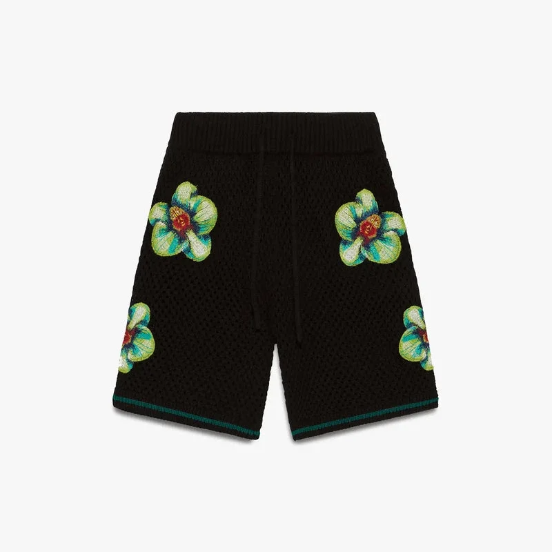 Glitch Orchid broderade virkade Shorts har en raffinerad design med konstverk som representerar den kontrasterande designfilosofin där naturen och det konstgjorda möts och samverkar i harmoni genom att visa orkidéblommans naturliga skönhet. Kompletteras med elastisk midja, dragsko och ribbad fåll.
