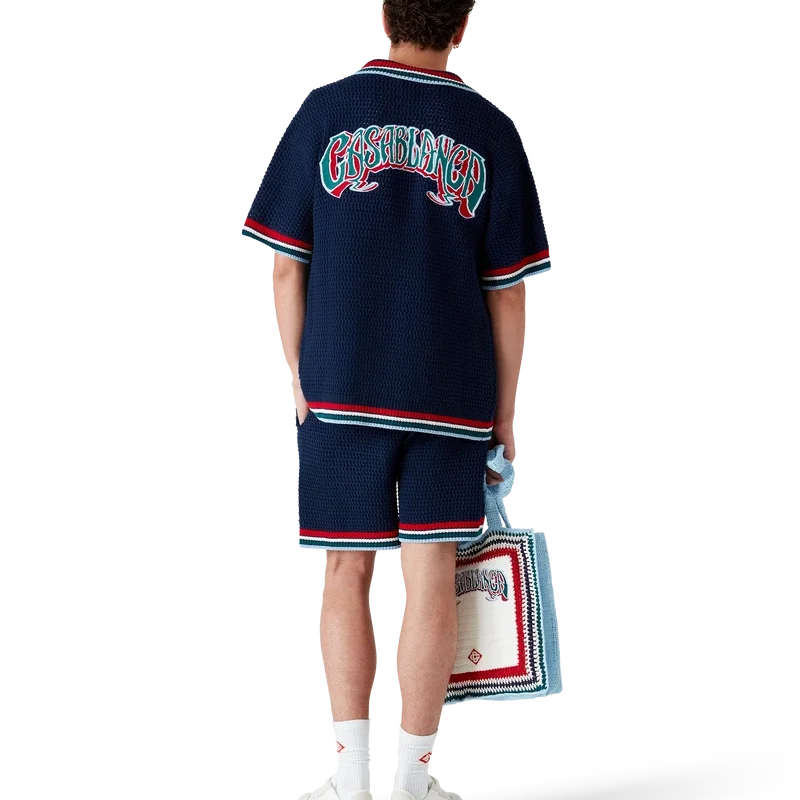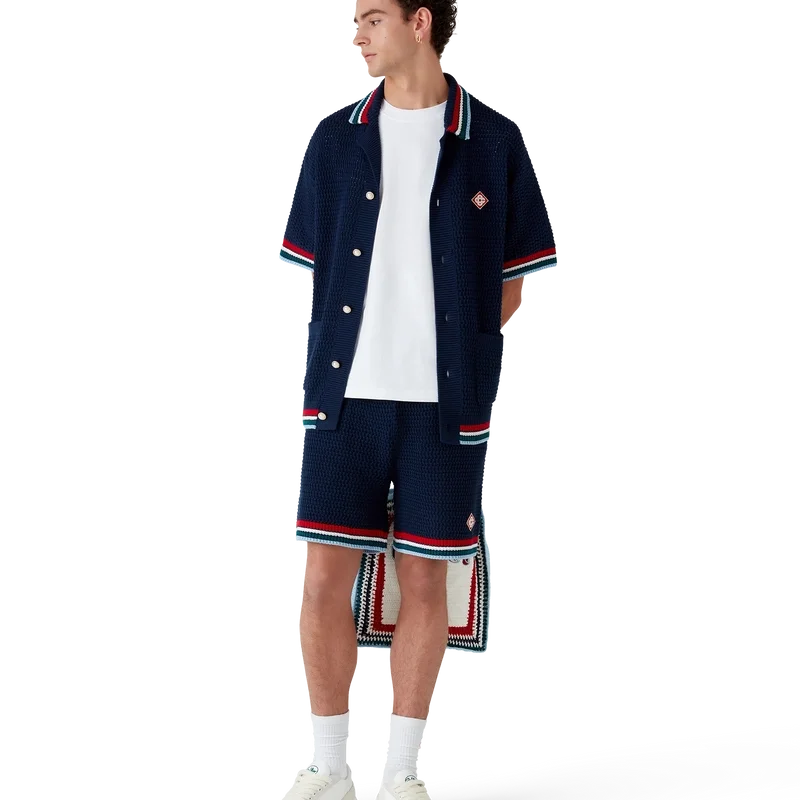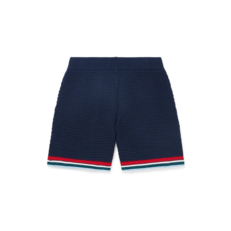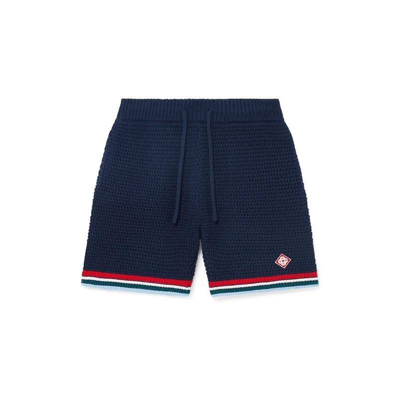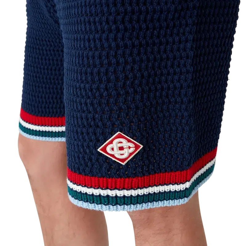 De gotiska virkade shortsen har en stickad design tillverkad av virkat bomullstyg och pryds av husets signaturdiamantlogotyp. De har en elastisk midjeresår, dragsko, fickor i sidosömmarna och randiga kanter i nederkanten.
