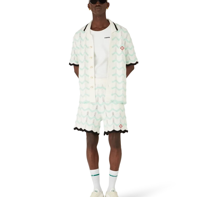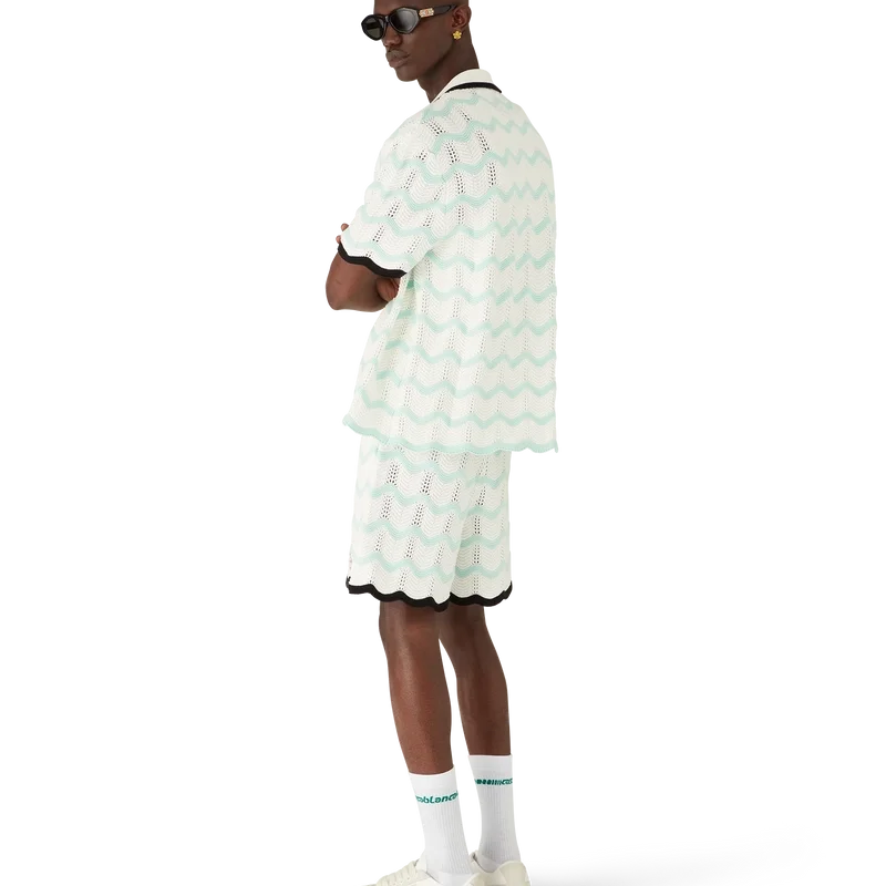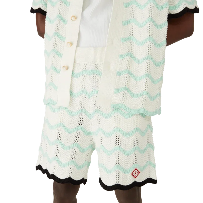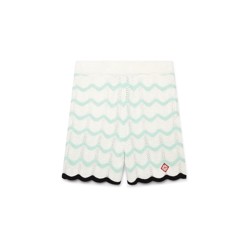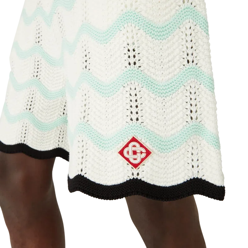 Gradient Wave-shorts i virkat bomullstyg har en stickad design med husets signaturdiamantlogo. Kompletterade med en svart kontrasterande ribbad midjeresår, dragsko, sidofickor i sömmen och vågformade detaljer i nederkanten.