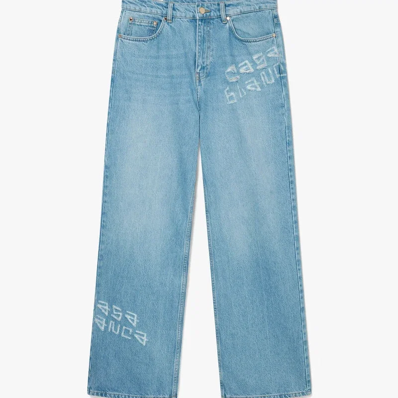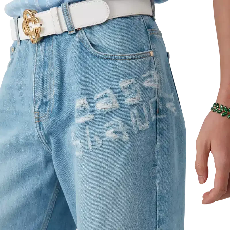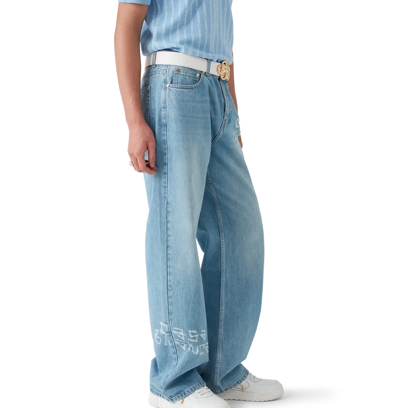 Graffiti Distressed Denim Jeans är ett par raka jeans tillverkade av bomullstyg och har det karakteristiska staplade logotypen i graffitistil ingraverat i tyget. Kompletteras med guldpläterade detaljer, bälteshällor, fram- och bakfickor, en läderlapp med märkeslogotyp och dragkedja.