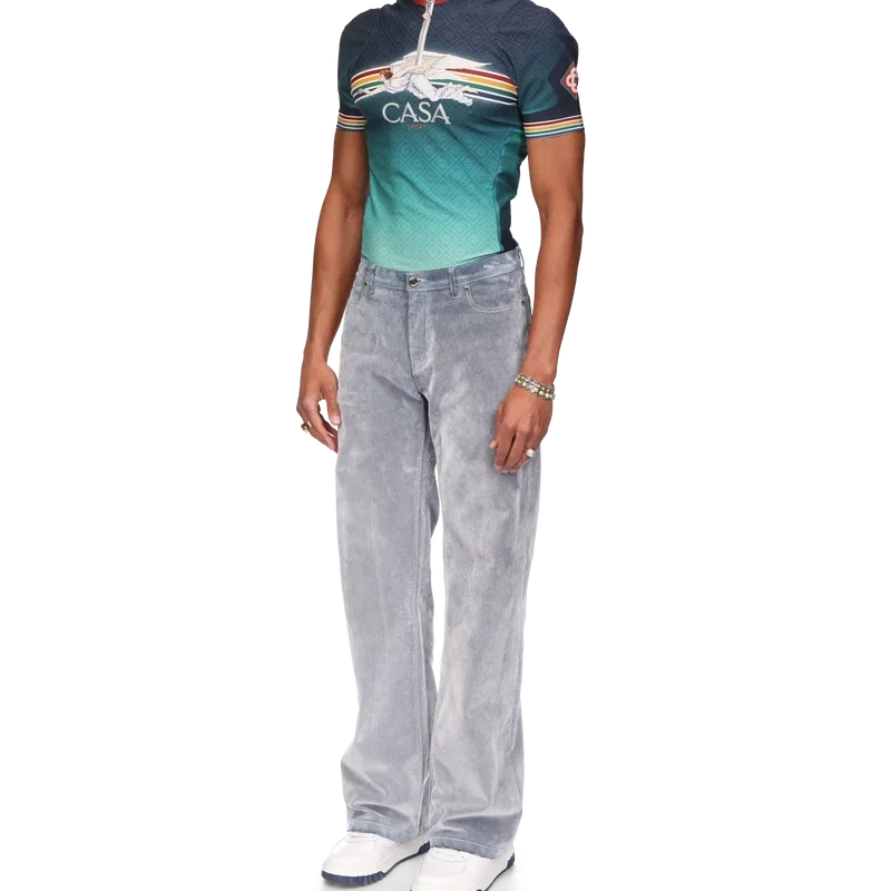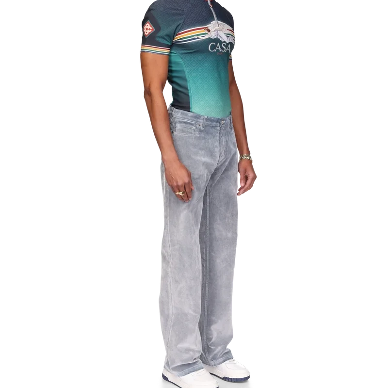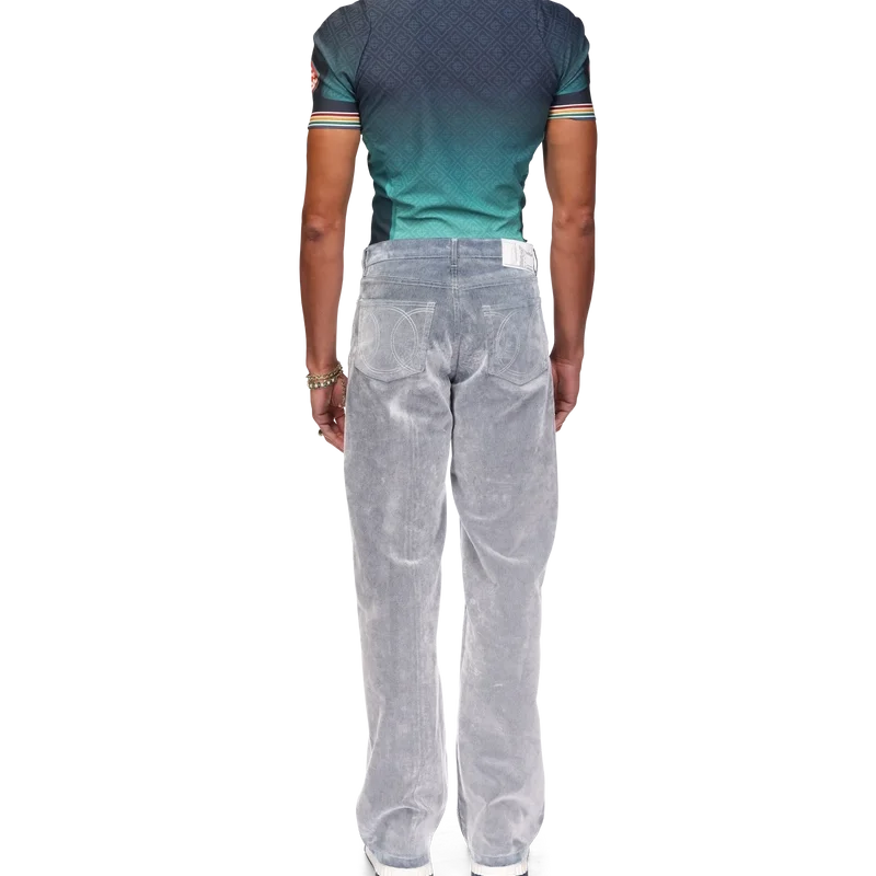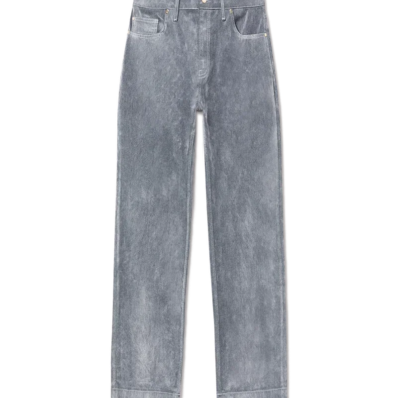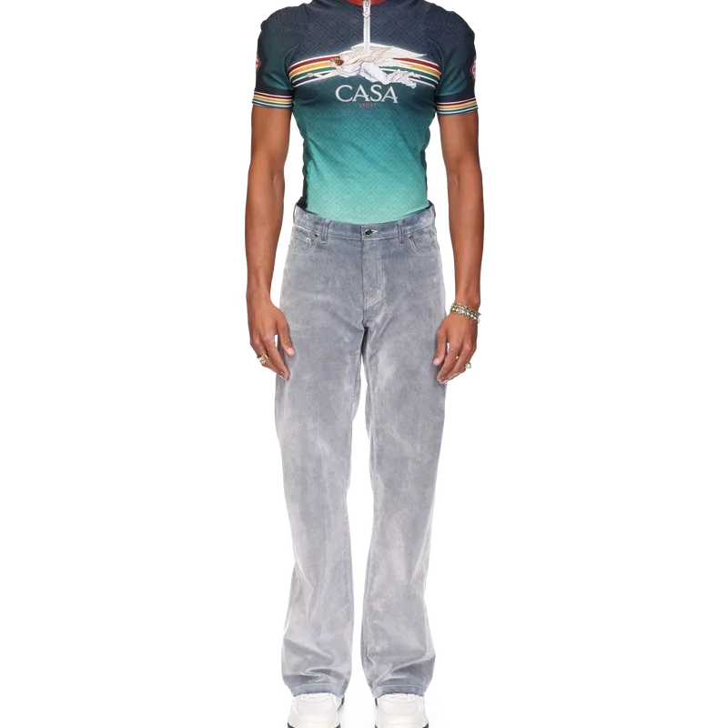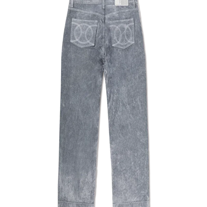 Jeansen med persikostruktur har raka ben och är tillverkade av ett bomullsblandat tyg. De har guldpläterade detaljer med märkeslogotyp, dragkedja, fickor fram och bak, en läderlapp med märkeslogotyp och bälteshällor.