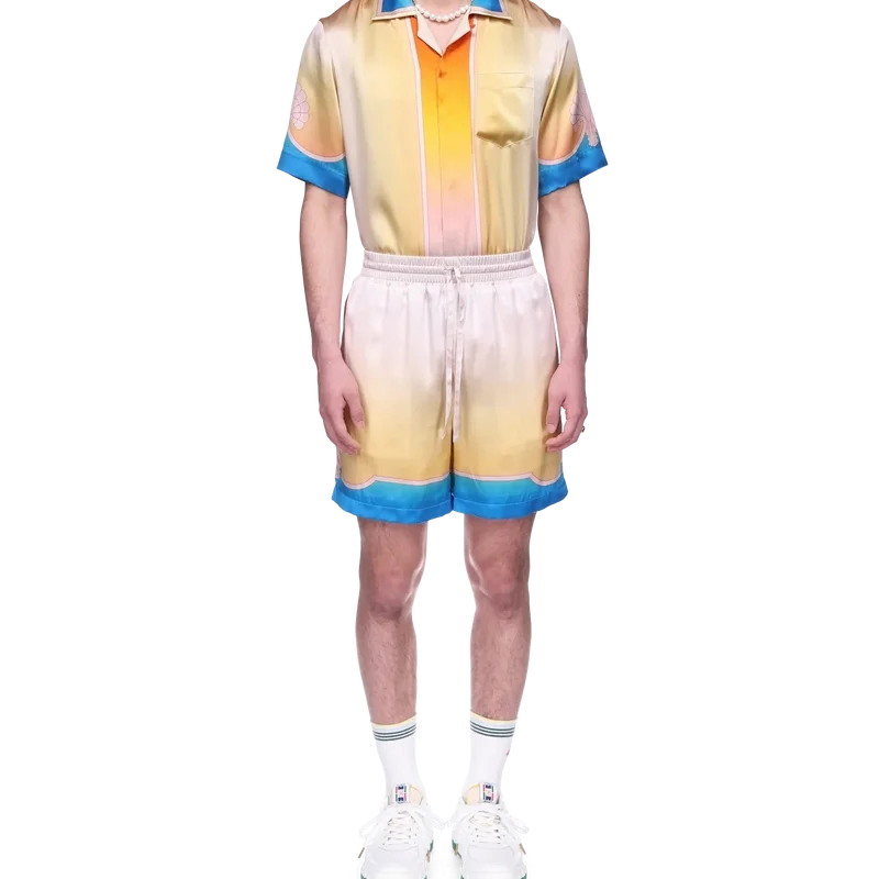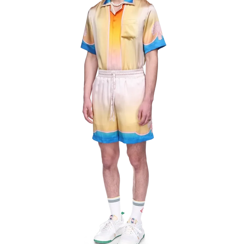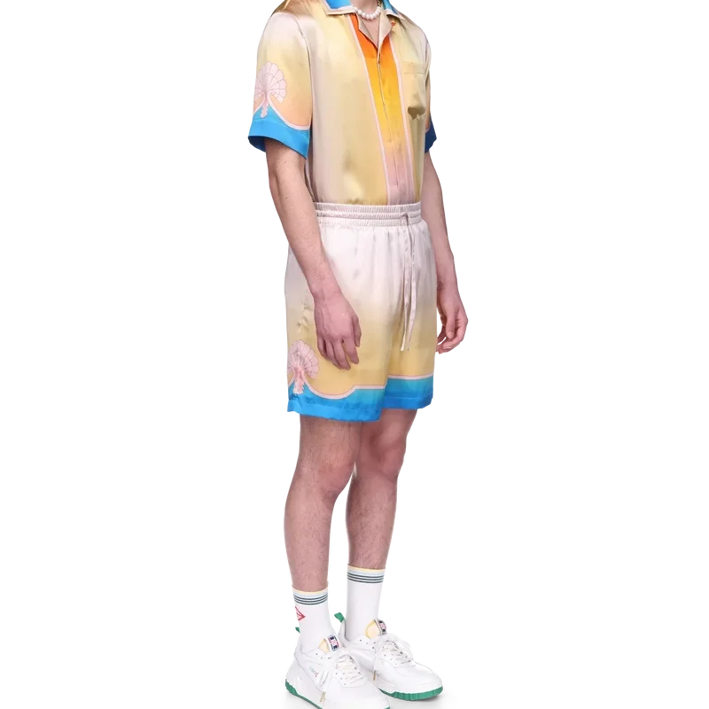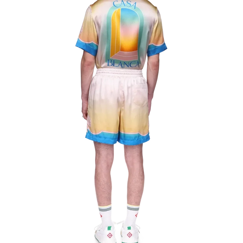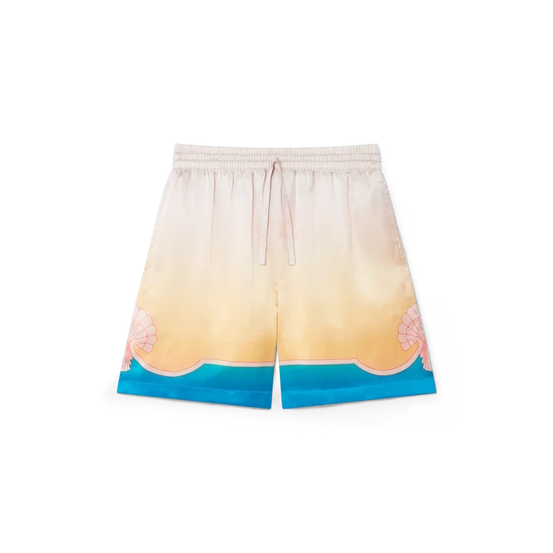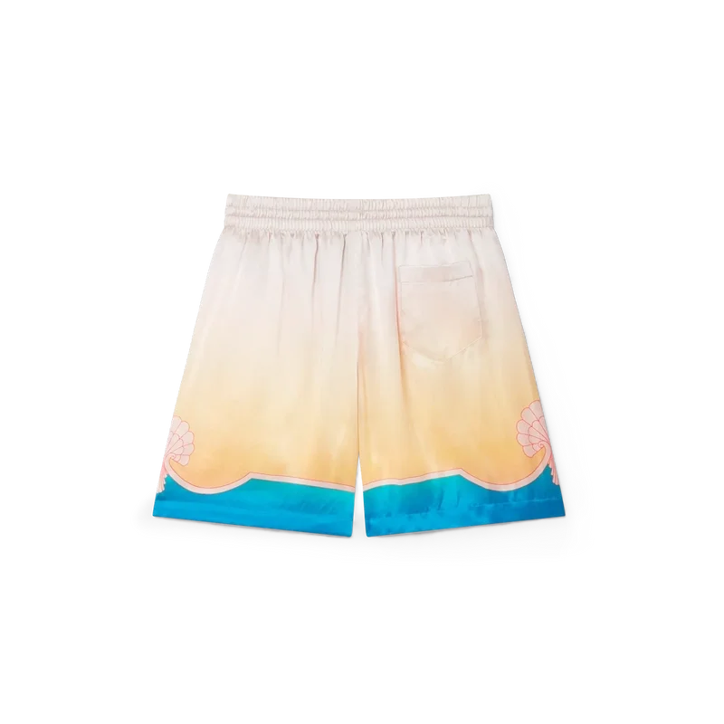 L’arc Colora-silkeshortsen har en välbekant design tillverkad av tryckt silkesatintyg och pryds av husets signaturmönster med gradient och snäckmotiv. Färgpaletten för denna kollektion är ljus och idealistisk och betonar de eteriska teman som är centrala för vårt varumärke. Kompletteras med randiga detaljer som bildar snäckmotiv i nederkanten, en elastisk midjeresår med dragsko, sidfickor och en bakficka.
