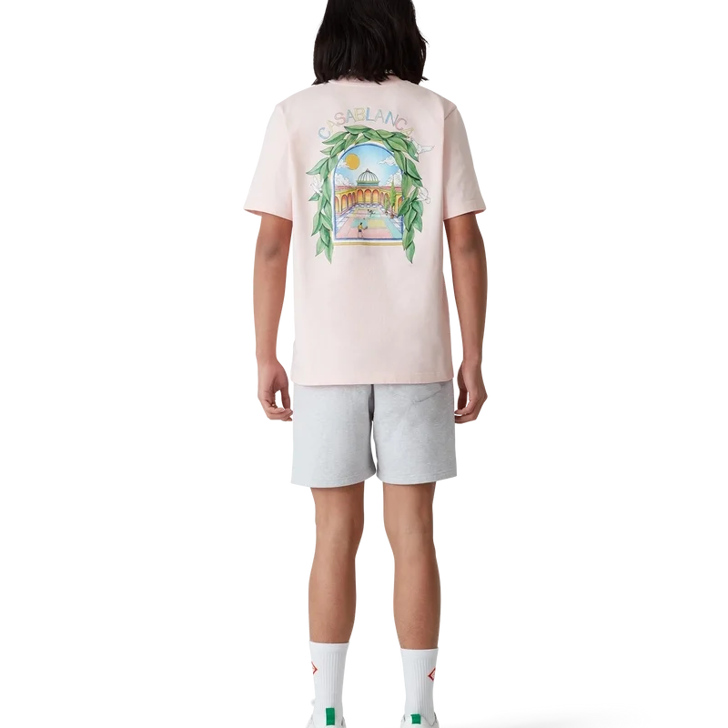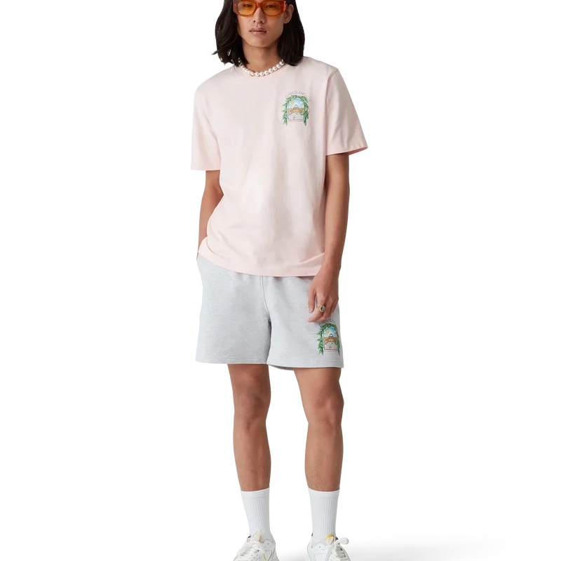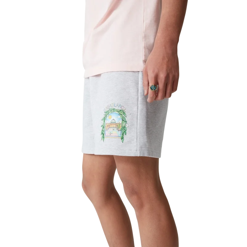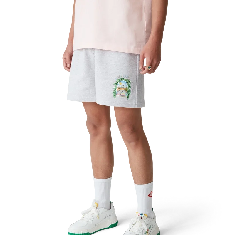 L’arche De Tennis-sweatshorts är ett tryckt plagg tillverkat av ekologisk bomull. De har resår i midjan, dragsko med gulddetaljer, sidofickor i sömmarna och en påsydd bakficka.
