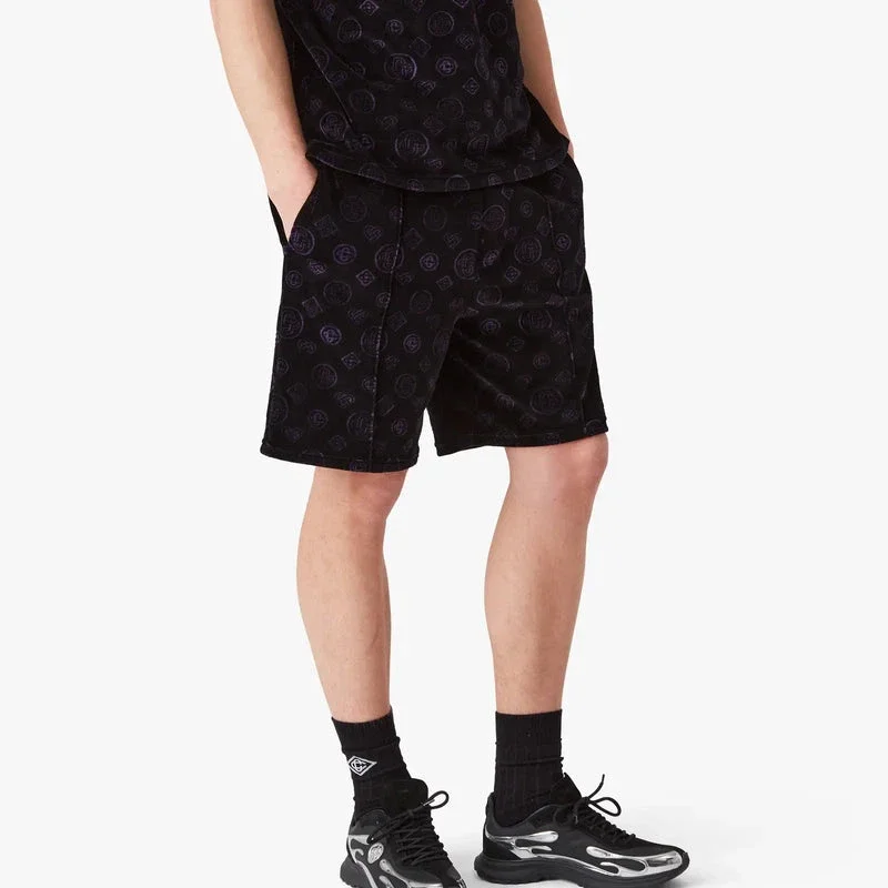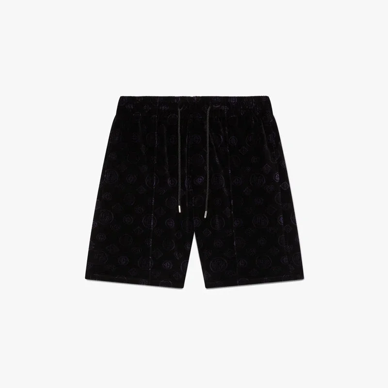 De lila velourshortsen med monogram har en raffinerad design med husets ikoniska monogrammönster över hela plagget. Och ett silverfärgat diamantlogo på benet. Kompletterade med ett silverfärgat diamantlogo, en elastisk midjeresår, dragsko, sidofickor i sömmen och en påsydd bakficka.