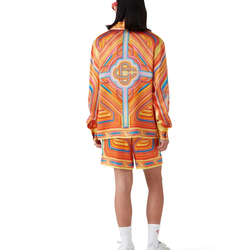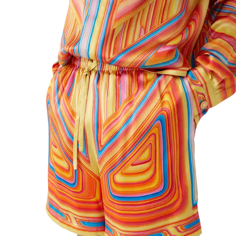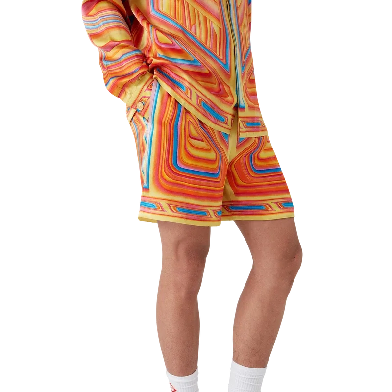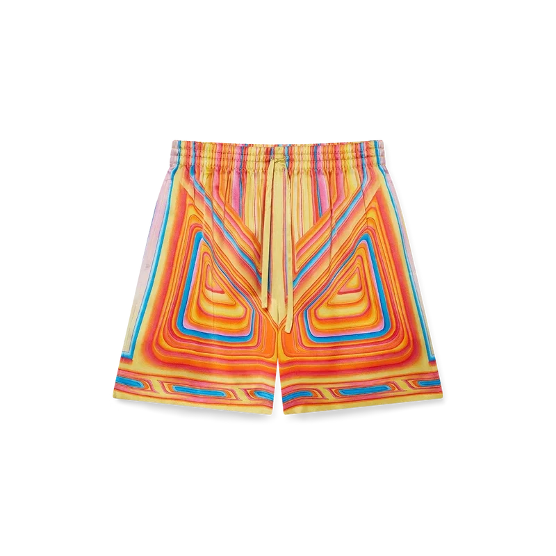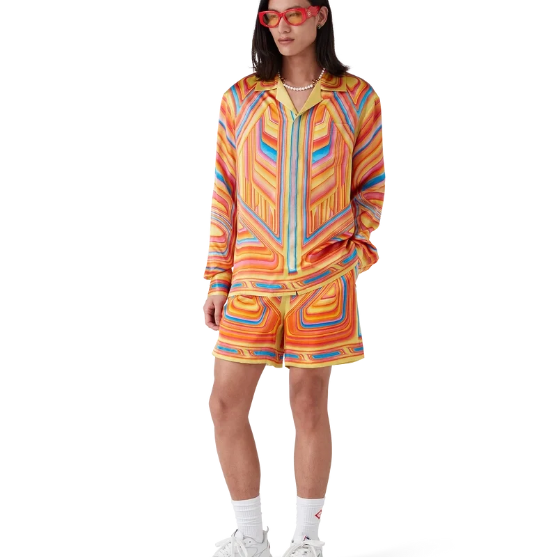 Low Rider-silkeshortsen har ett heltäckande tryckt mönster och är tillverkade av silkesatintyg med husets säsongsbetonade konstverk som refererar till de poppiga färgerna och airbrush-målningsteknikerna som används på lowrider-bilar, med Casablanca-logotypen. Kompletteras med resår i midjan, sidofickor i sömmen, en påsydd bakficka, dragsko och foder.