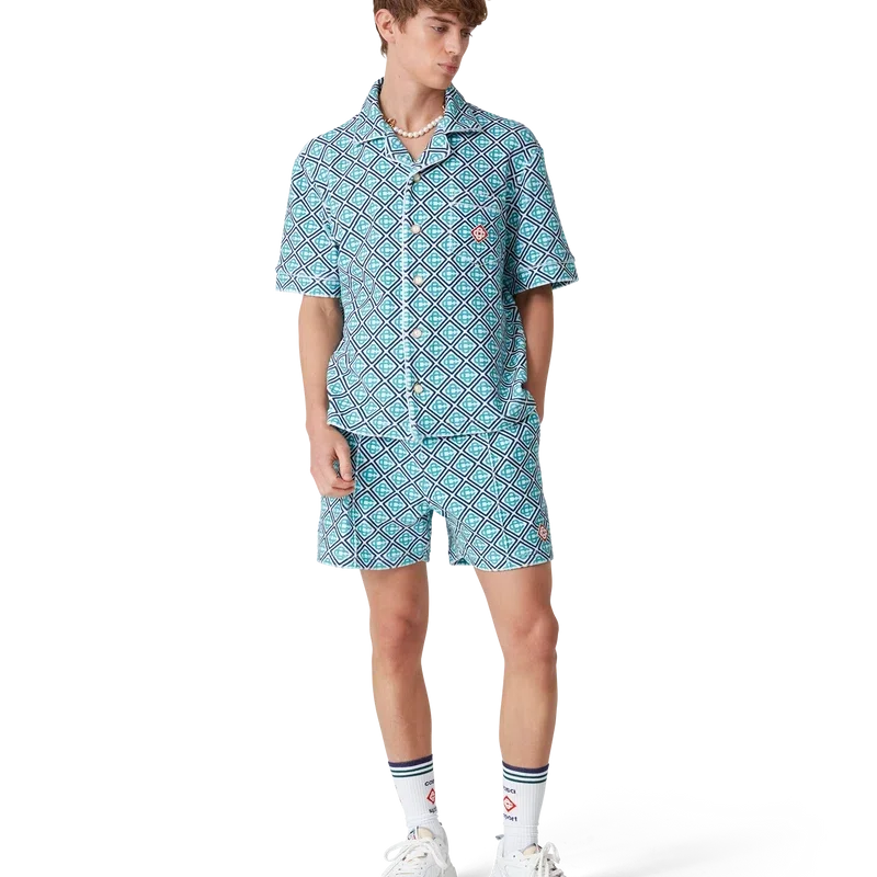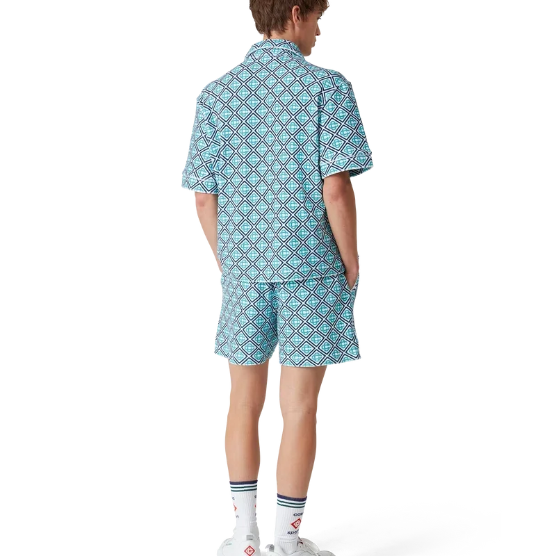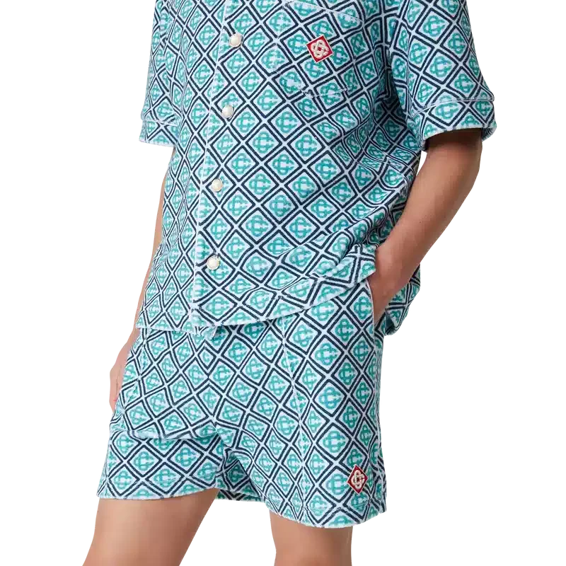 Monogram-frotteshortsen har en klassisk design tillverkad av ett Monogram-frottetyg som ger en ny twist på det karakteristiska Casablanca-mönstret. De har en elastisk midjeresår, en dold dragsko med gulddetaljer, veckade sömmar längs framsidan, en bakficka med dragkedja, snedställda sidfickor samt pipingdetaljer på bak- och framfickorna samt längs sidorna.