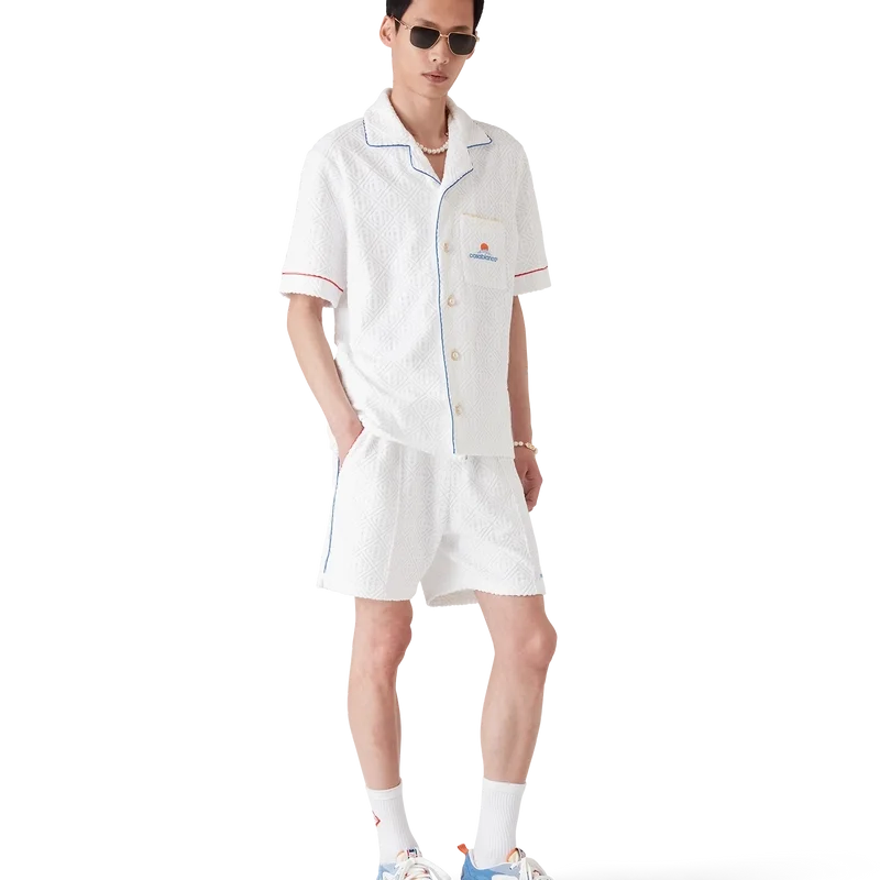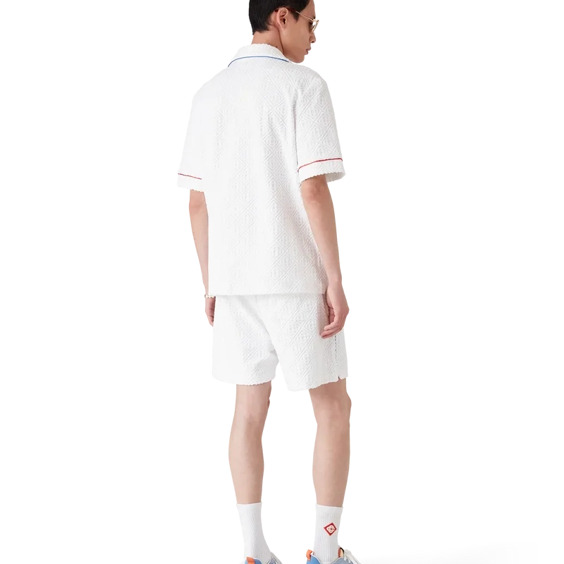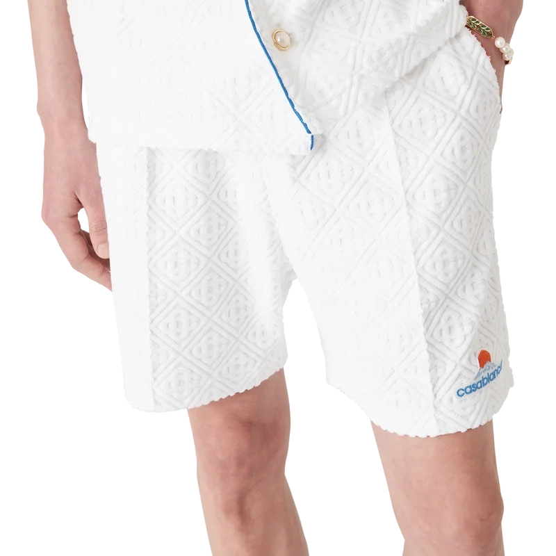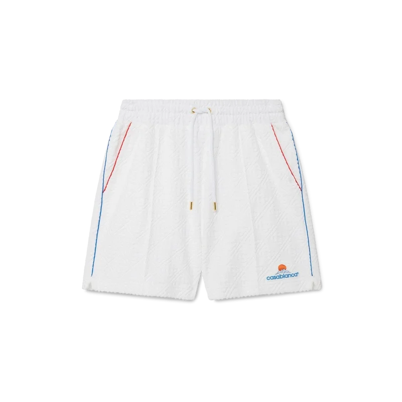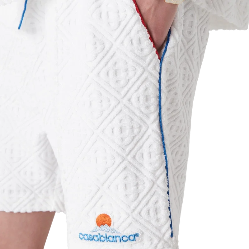 Monogram-frotteshortsen har en klassisk design och är tillverkade av ett Monogram-frottetyg. De har en elastisk midjeresår, dragsko med guldspetsar, guldöglor, veckade sömmar framtill, en bakficka, snedställda framfickor samt kantband på bak- och framfickorna samt längs sidorna.
