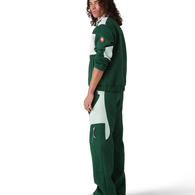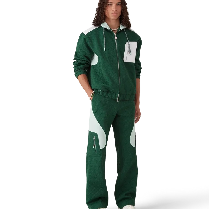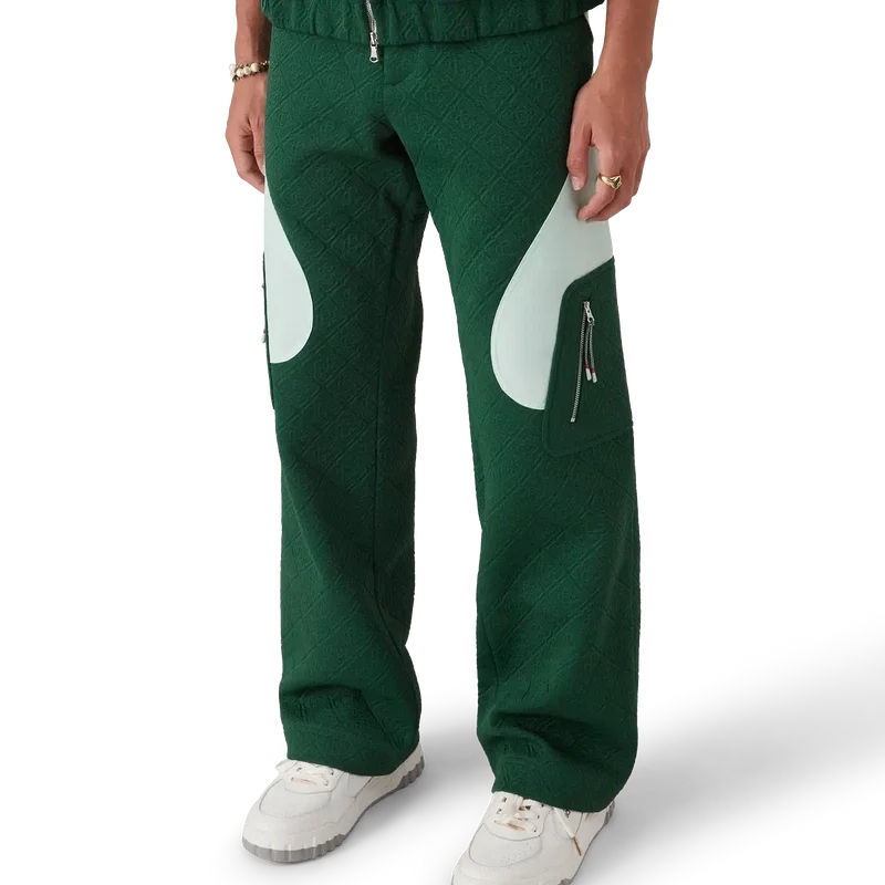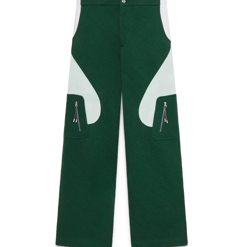 Monogram Jacquard-stickade byxor har raka ben och kontrasterande färgblock. De har en midjeresår med guldpläterad tryckknapp med märkeslogotyp, dragkedja, kontrasterande sidopaneler, snedställda framfickor och påsydda sidfickor med vertikala dragkedjor och dragband inspirerade av bergsklättringsrep.