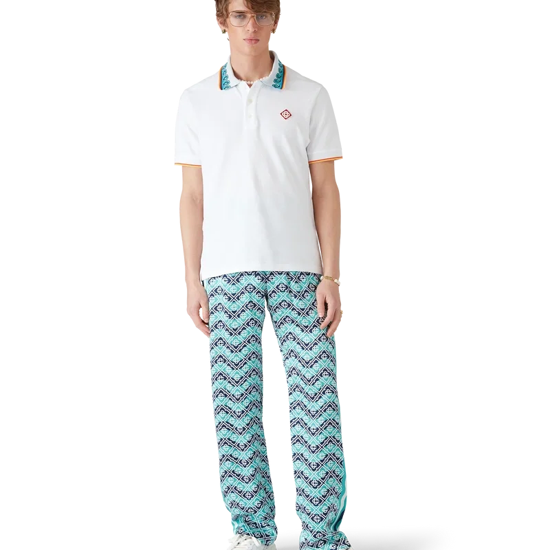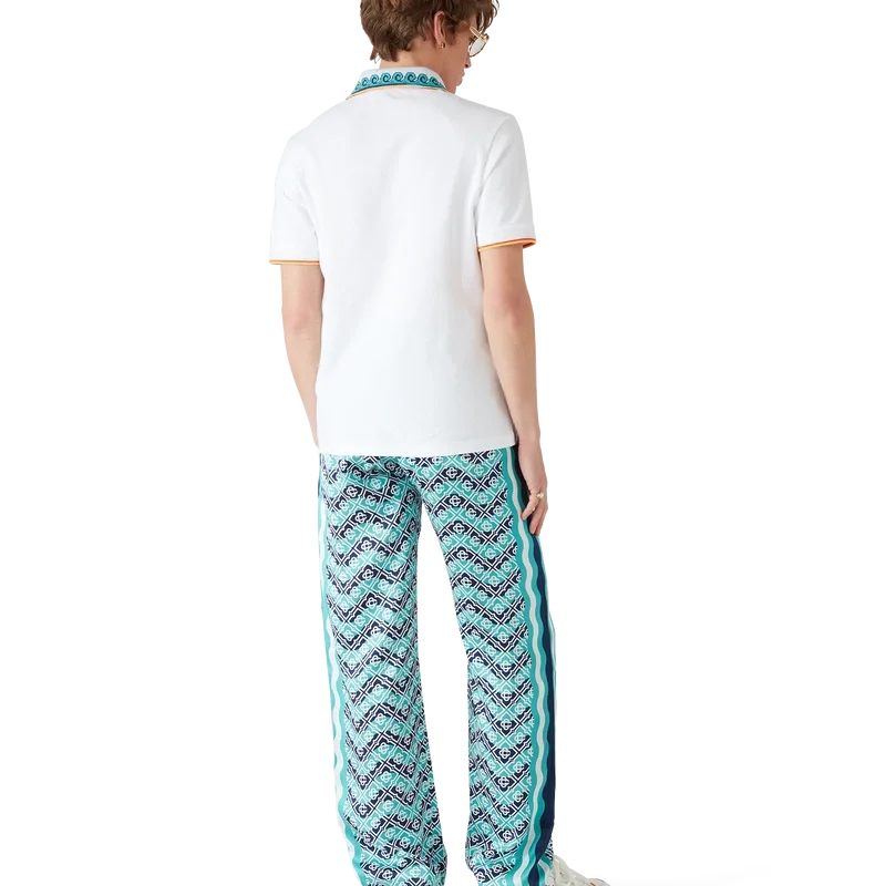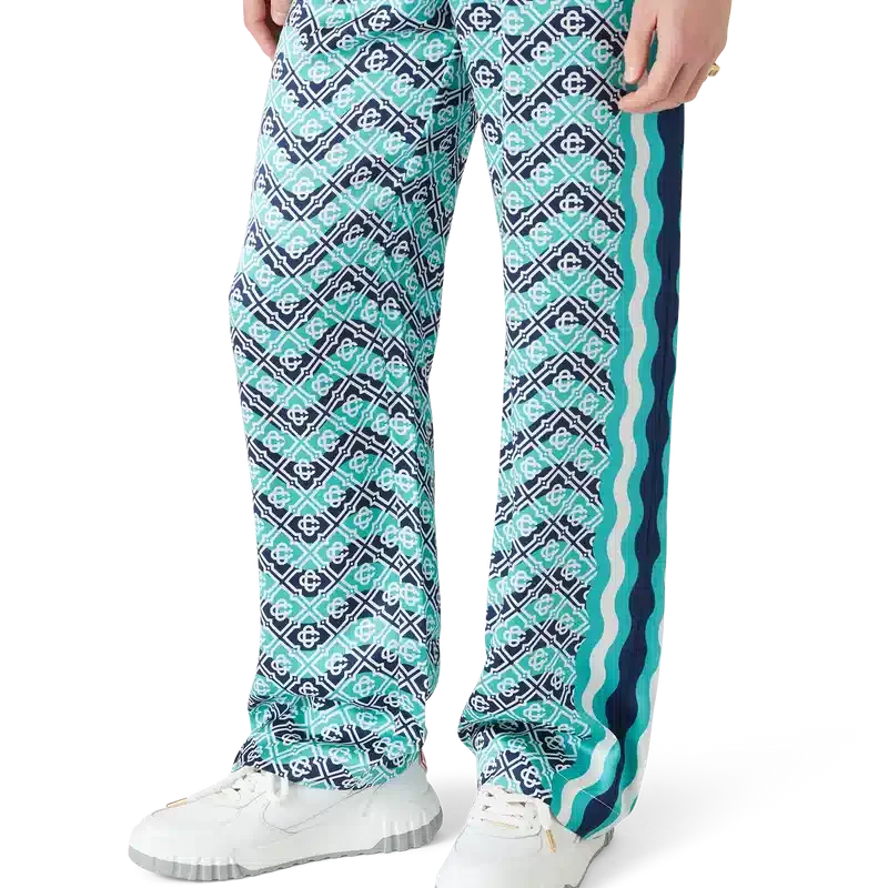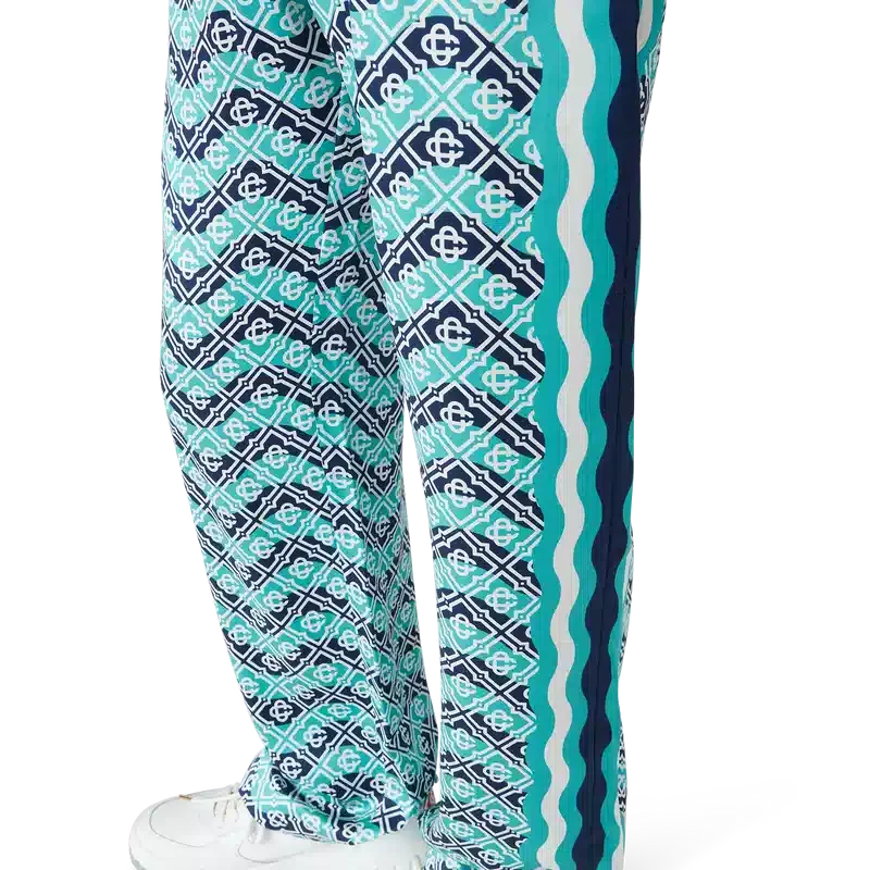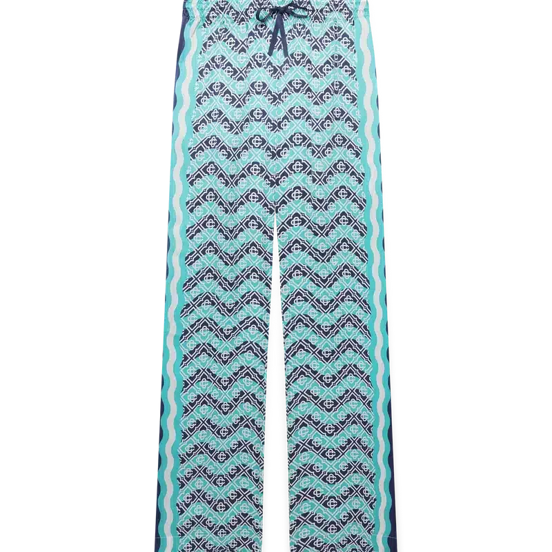 Monogram Wave-byxorna är ett heltäckande tryckt plagg i husets signaturmönster Monogram, tillverkat av silkesatintyg. Försedda med elastisk midjeresår, dragsko, Memphis-våg-inspirerade randdetaljer längs sidorna och infällda sidfickor.