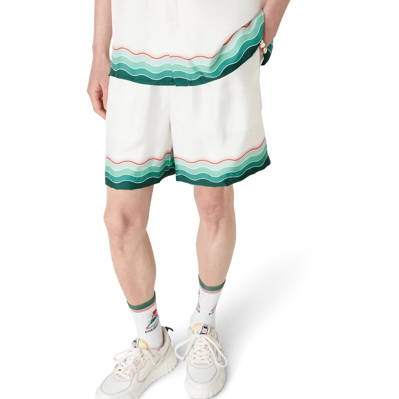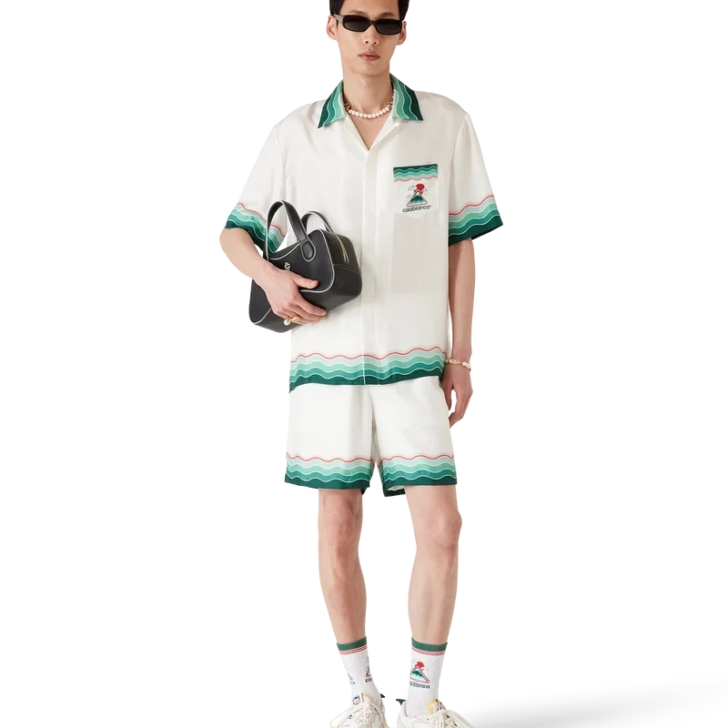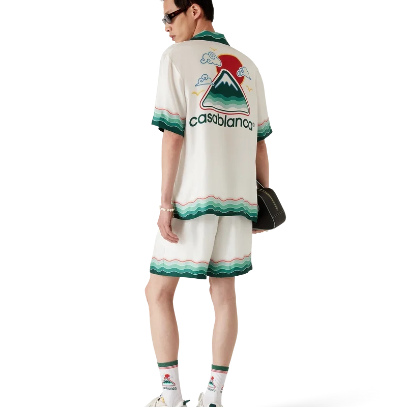 Montagne Ondulee-silkesskjortan är en kortärmad skjorta med heltryckt mönster som visar husets säsongsbetonade konstverk – med inspiration från Japans rika ikonografi för denna kollektion, med en enkel layout och konstverk som förmedlar ett starkt visuellt budskap med bara några få linjer och färger, vilket gör den till ett av kollektionens symboler – tillverkad av silketwilltyg. Kompletterad med elastisk midja, dragsko, sidofickor i sömmarna, en bakficka och Memphis-våginspirerade randiga detaljer på fållen och bakfickan.