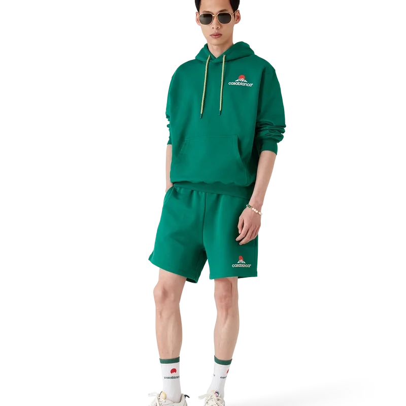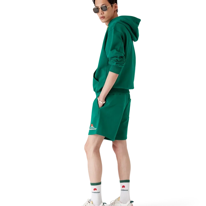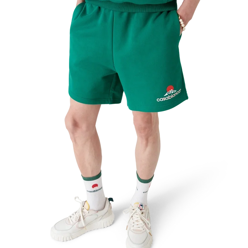 Casablanca Montagne-sweatshorts är ett sportplagg tillverkat i jersey av bomull med märkets säsongsbetonade motiv – en logotyp som först ser ut som ett berg men som, när man tittar närmare, bildar ordet ”Casa”. De har en elastisk midjeresår, dragsko med gulddetaljer, fickor i sidorna och en påsydd ficka baktill.