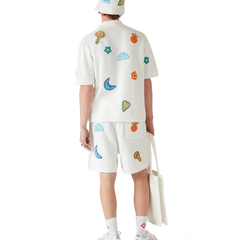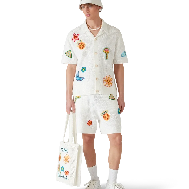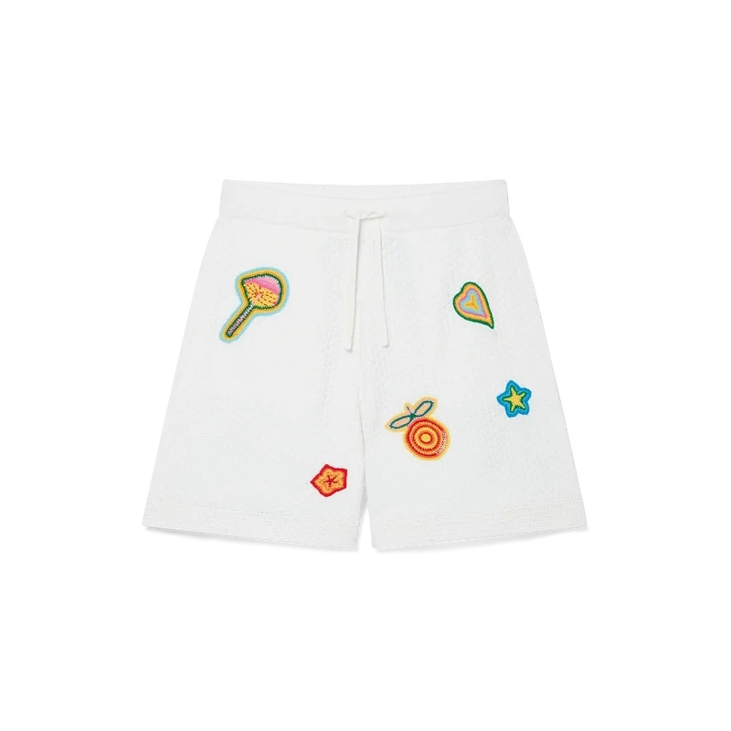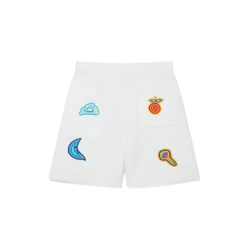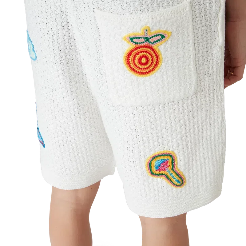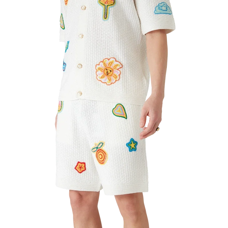 Motif Crochet Shorts är ett knälångt par shorts tillverkat av merseriserat bomullstyg med virkade motiv. De är försedda med husets klassiska designelement, en elastisk midja, dragsko och snedställda framfickor.