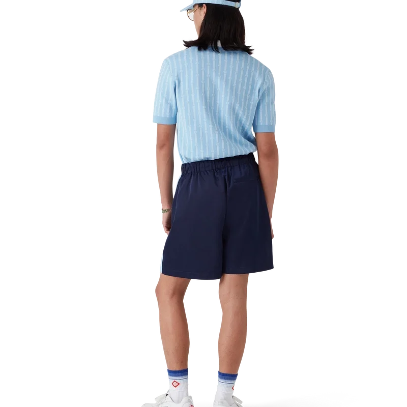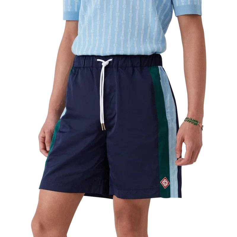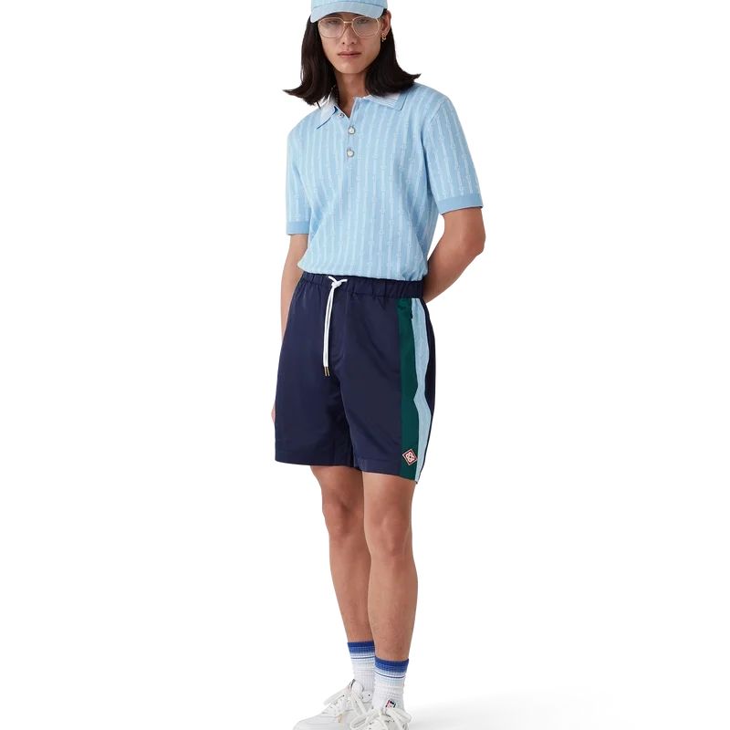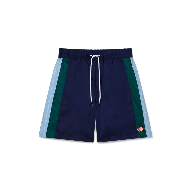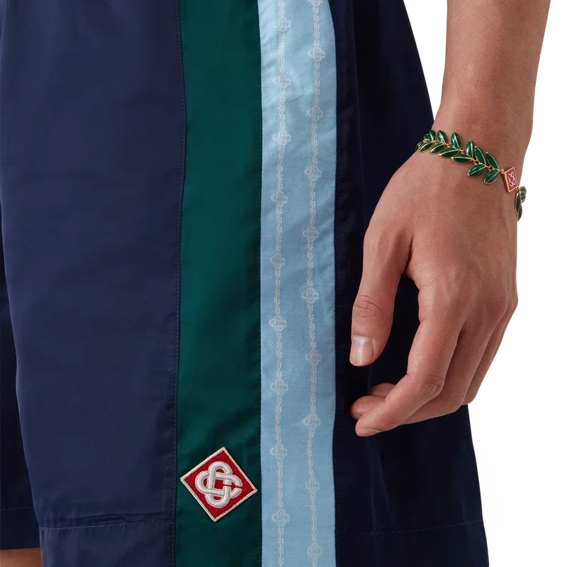 Laurel Stripe-träningsshortsen är en modell i medellängd tillverkad av tekniskt tyg med husets signaturdiamantlogo. De har elastisk midja, dragsko med guldspetsar, sidofickor med dragkedja i sömmen, randiga detaljer längs sidorna och en bakficka med dragkedja.